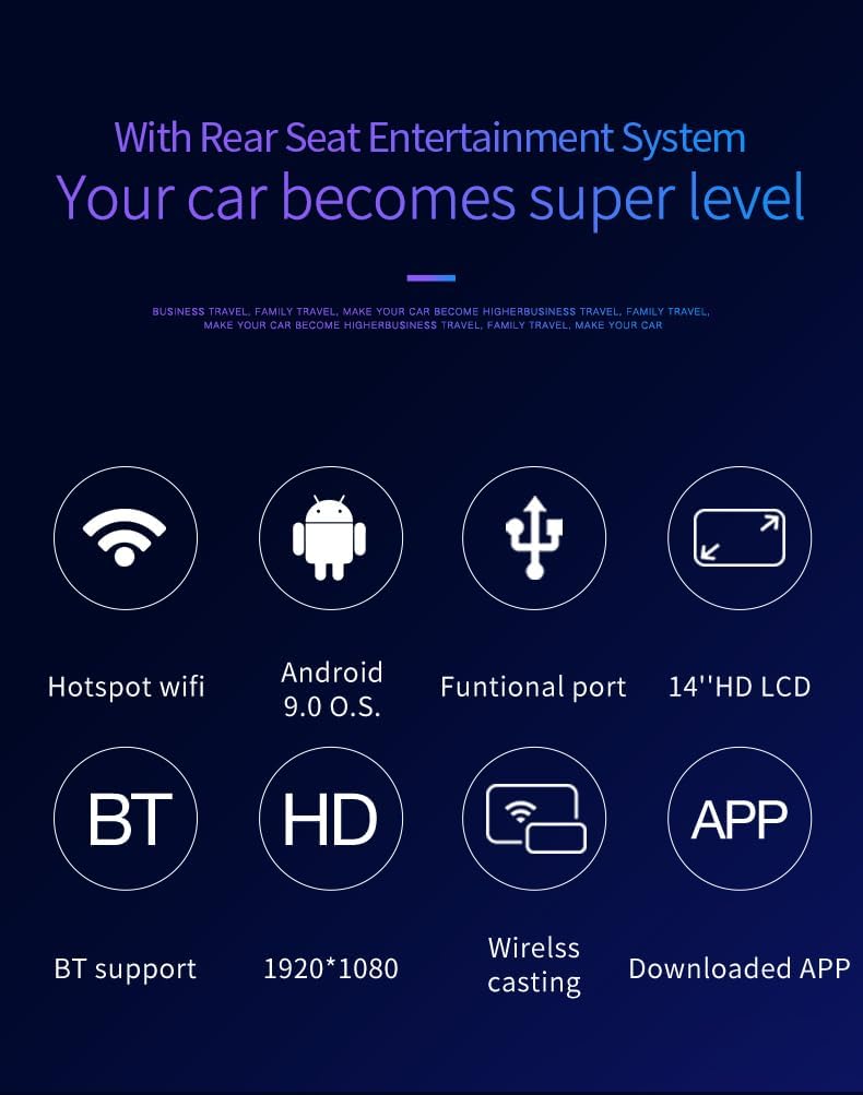 Universal Car Rear Seat Entertainment System Video PlayerThis is a powerful 14-inch car headrest monitor, it is equipped with Android 9.0 system, you can download and install APP by yourself. it has a super high 1920*1080 screen resolution and an IPS touch display. Also, it supports wireless connection for cell phones. With it, mount it on the back seat of your car, which is pretty great for car travel. At the same time, you can also bring it home to use as a big screen Android tablet.Compatible with more than 98% of the car models installed on the market (as long as the headrest is a round pole).Support WiFi and hotspotHDMI IN+OUTOTA Cloud Update16-Colors Ambient Light