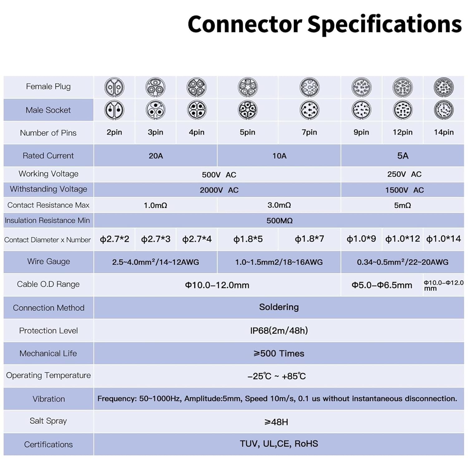 Electrical ConnectorLP20 Waterproof Electrical Circular Connector Single Hole Mount Bulkhead IP68 Waterproof Soldering Wire Quick ConnectorFeatures:IP68 Waterproof RatingWith an IP68 waterproof rating, this connector can withstand extreme conditions, making it ideal for outdoor applications. MaterialThis connector boasts durability and longevity, ensuring reliable performance in various environments.Easy InstallationFeaturing a single hole mount design, this connector offers a quick and easy installation process, saving you time and effort.Soldering Wire Quick ConnectorThe soldering wire quick connector feature ensures efficient connections, enhancing the overall functionality of your electrical setup.==========Hign-concerned Chemical : NoneModel Number : LP20 bulkhead connectorCable Specification(2~4pin) : 2.5~4.0mm²/14-12AWGDiameter Range(2~7/14pin) : OD 10.0~12mmRated Current : 5A~20AOperating Voltage : 250V-500V ACContact Resistance(Max.) : 1~5m OmegaInsulation Resistance(Min.) : 500M OmegaProtection Level : IP68Working Temperature : -25~+85 Degree CentigredeConnecting Mode : Screw ConnectorSoldering : Easy Locking TypeAssembly style : SolderingColor : BlackFeatures : BulkheadCable Specification(5~7pin) : 1.0~1.5mm²/18-16AWGCable Specification(9~12pin) : 0.34~0.5mm²/22-20AWGDiameter Range(9~12pin) : 5.0-6.5mmConnector type : Panel connector