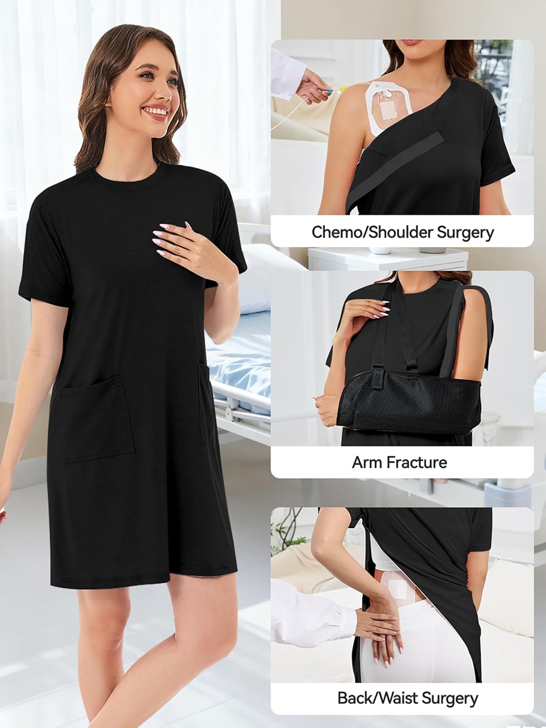 This 2-pack includes one shoulder surgery shirt with pockets and one open-back hospital nightgown, designed for rotator cuff recovery and adaptive wear for the elderly.