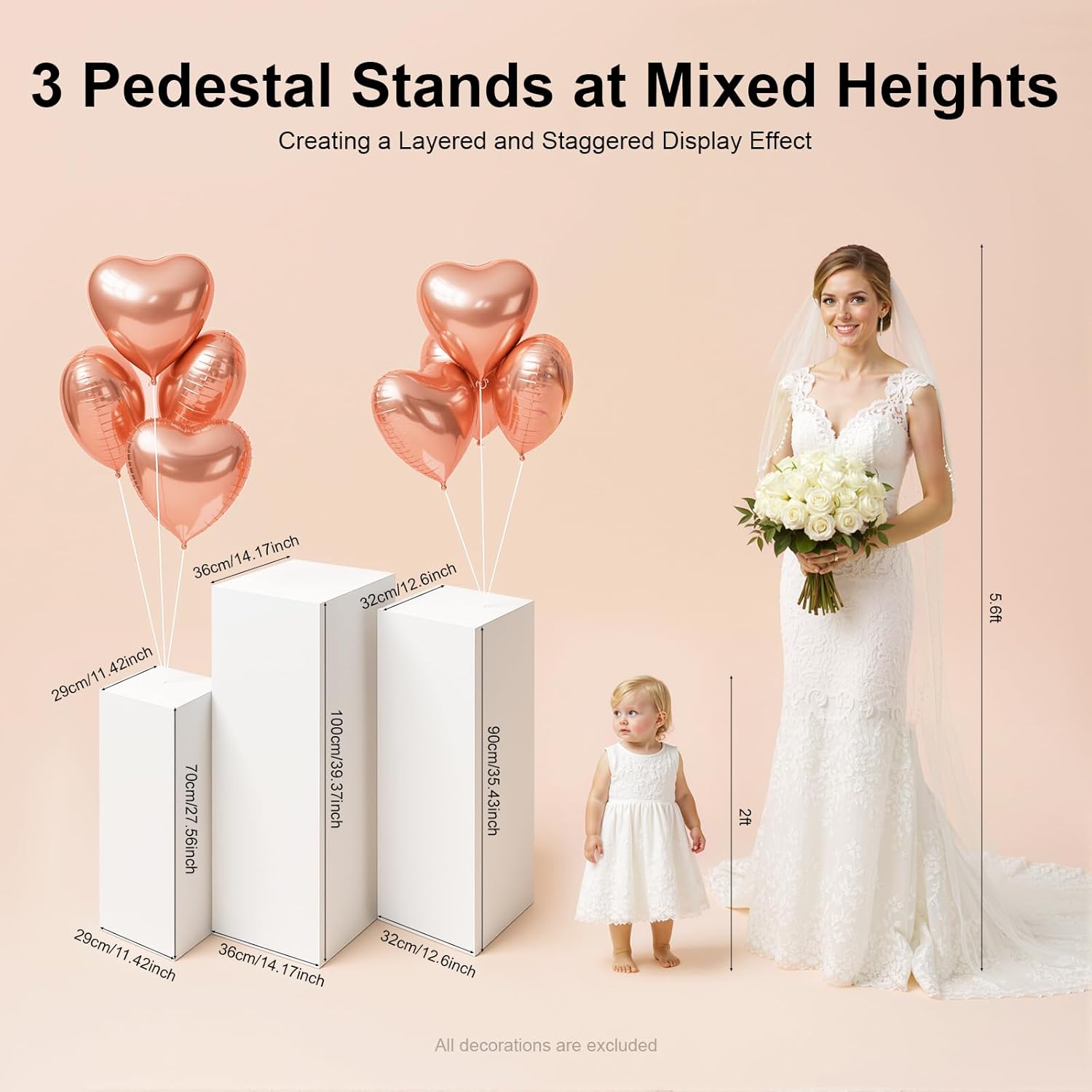 DescriptionFor a display that makes a statement of understated elegance, this three-piece set of iron pedestal stands delivers. Each piece features a sleek profile with a pure white finish, engineered for robustness and adaptability. Ideal for enhancing interiors or gracing special events from weddings to gallery exhibitions, it introduces a note of refined simplicity wherever it is placed.SpecificationsColor: WhiteMaterial: IronProcess: Baking PaintMount Type: Free StandingAssembly Required: NoEach Load Bearing Capacity: About 30kg/66.14lbsProduct Size: 29*29*70cm/11.42*11.42*27.56in, 32*32*90cm/12.6*12.6*35.43in, 36*36*100cm/14.17*14.17*39.37inPackage Size: 103*40*40cm/40.55*15.75*15.75inGross Weight: 17kg/37.48lbsNet Weight: 16.15kg/35.6lbsPackage Included3* Display Pedestal StandsNotes1. Please check the size carefully before ordering.2. Please use the product within its load-bearing capacity.3. Please allow the slight color difference caused by the shooting light and a 1-3cm error due to manual measurement, and make sure you do not mind before you order.