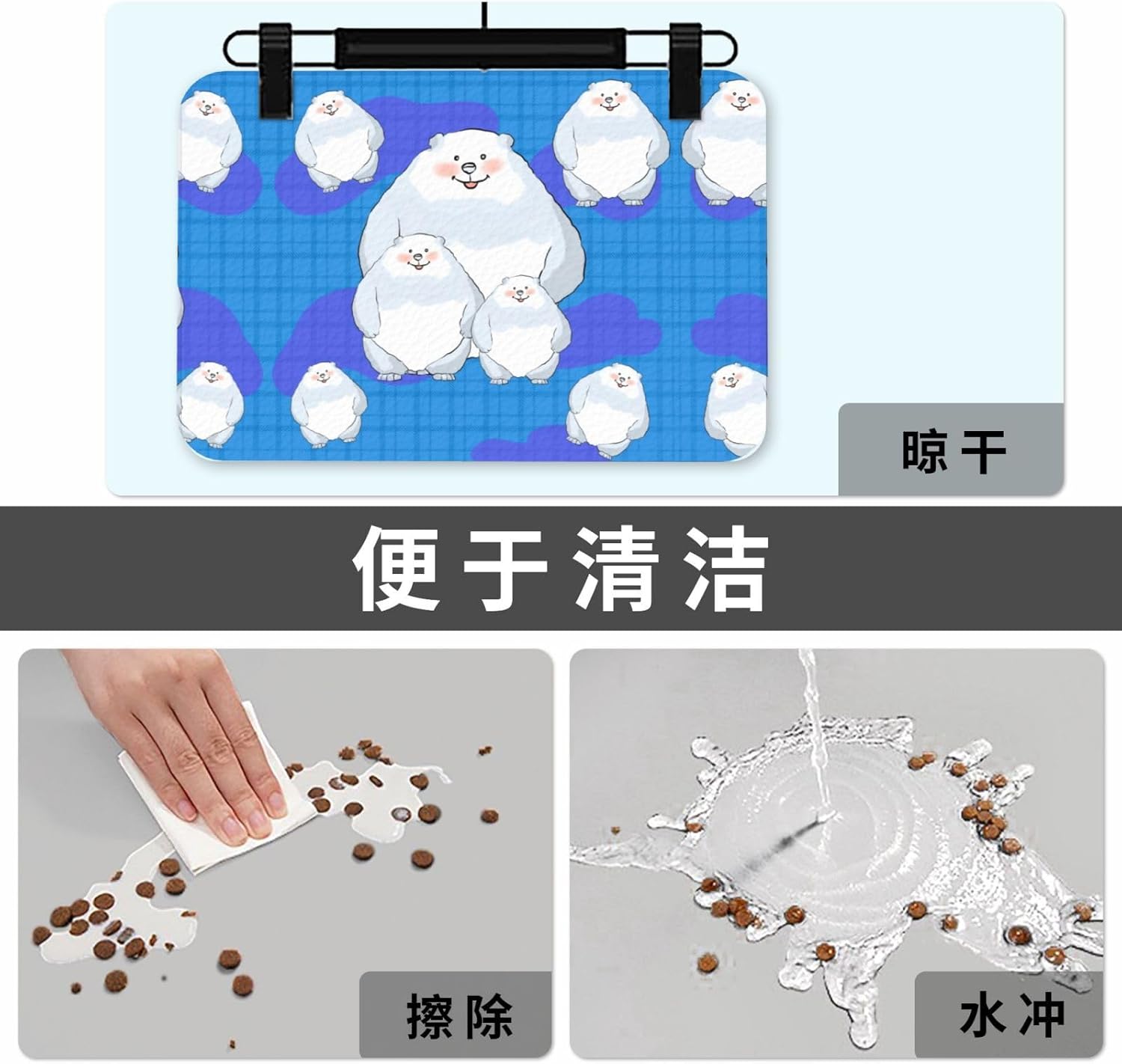 Transform your pet's mealtime experience with our high-quality Pet Absorbent Leather Tablecloth Foldable Non-Slip Placemat. Our White Bear Family print pet feeding mats are made of high quality and durable material that can withstand scratches, tears and daily wear and tear. The cute White Bear Family print pattern design on the mat adds a splash of color to your pet's feeding area and enjoy more fun. Whether you have a dog, cat, or another furry friend, this versatile product ensures cleanliness by preventing liquids from seeping through and damaging floors.The placemat's superior absorbency quickly dries any spilled water or food, keeping both your pet and surroundings tidy.For added practicality, the 40x60cm mat is foldable and reusable, allowing you to store it conveniently or carry it along during travels. Cleaning is a breeze - you can either rinse it thoroughly or simply wipe it clean.