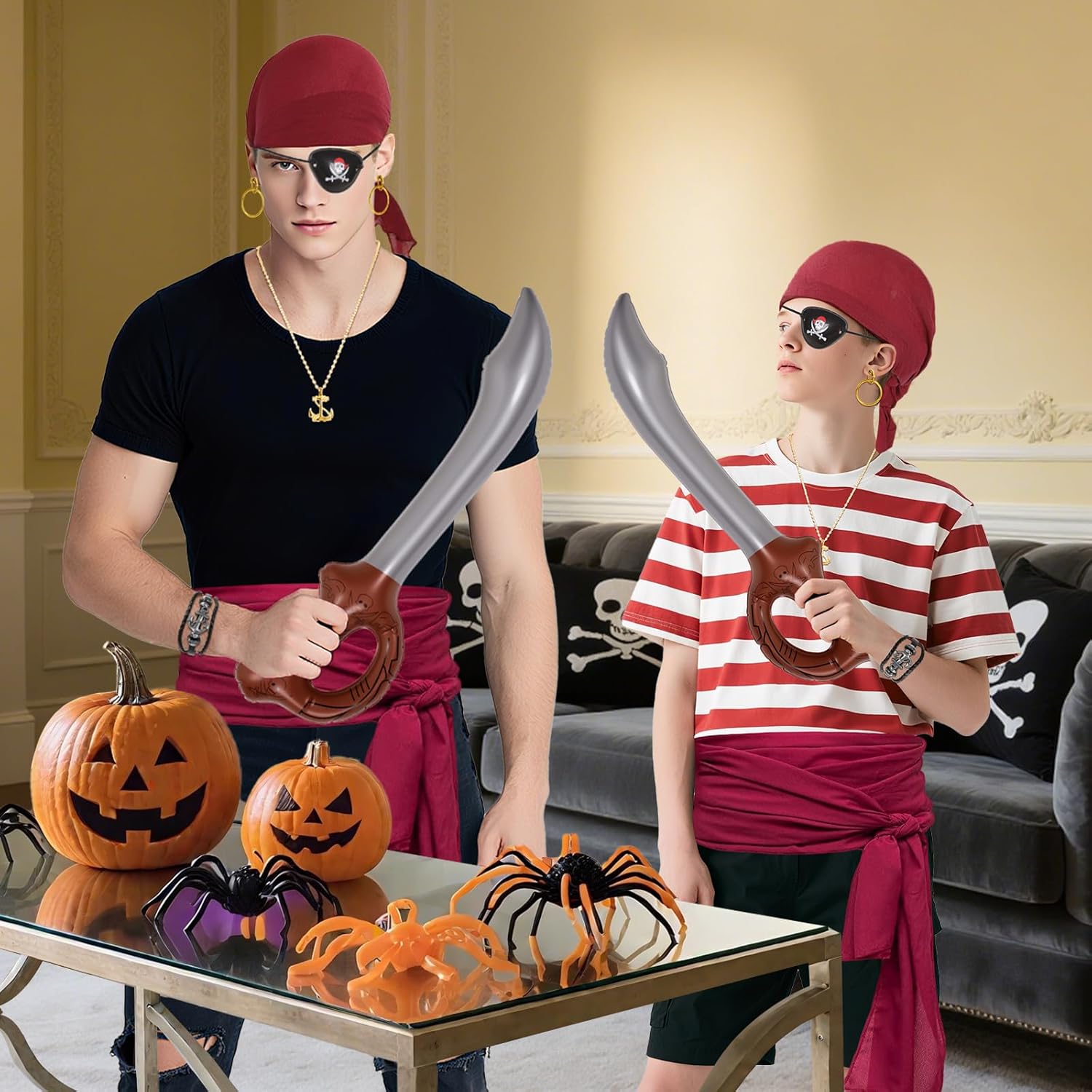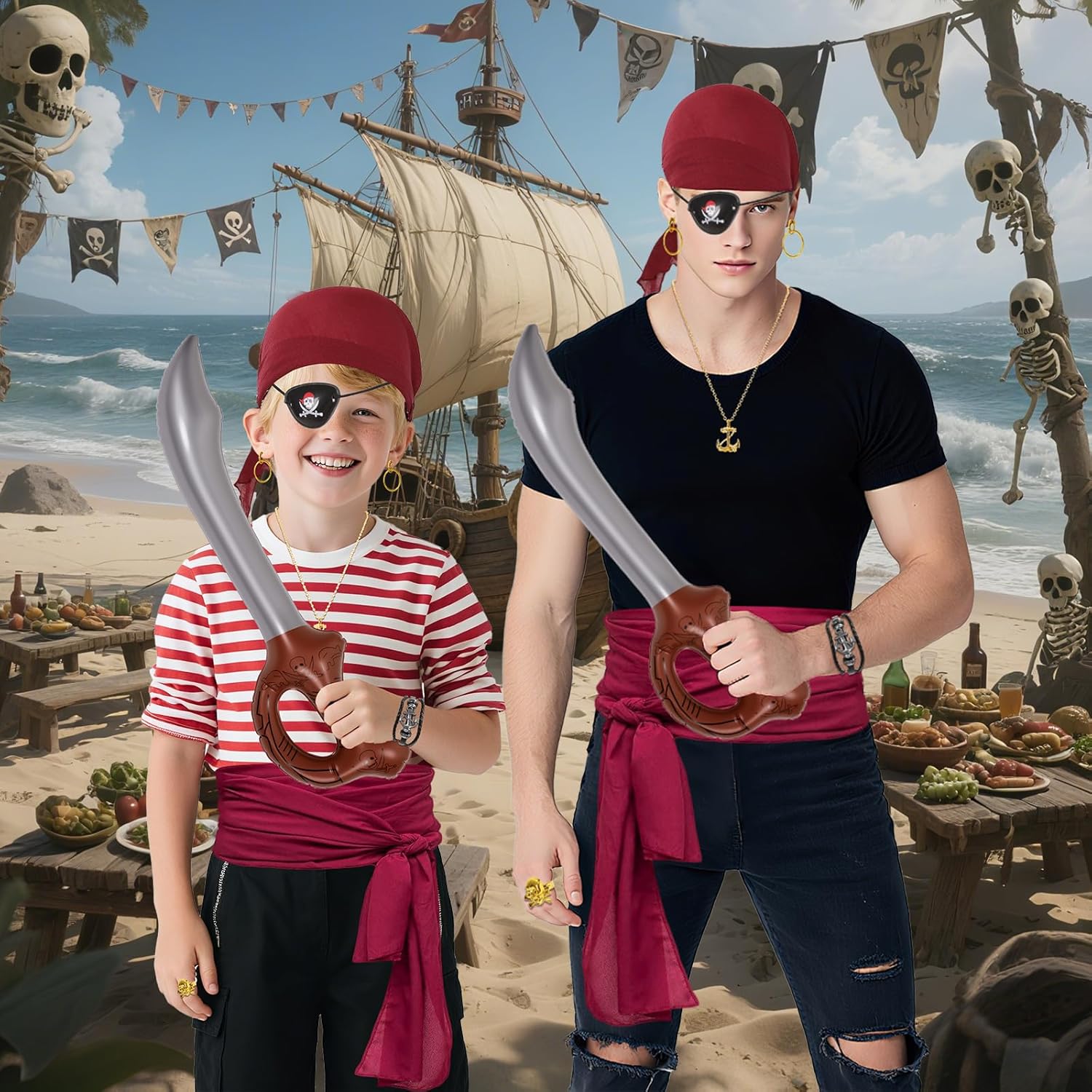 Why Choose Our Pirate Costume Accessories?Abundant pirate costume set is enough to meet your daily applying and sharing demands! You could wear them together or separated to create different looks!Premium PVC and plastic material, durable and reusable, lightweight for portable carry, measures approx. No plastic sharp edge which is safer.Pirates have become a fascinating and popular figure in modern culture, and from festivals to theme parties, pirate costumes have become a popular costume choice. Package Includes: ️1*Headband1*Belt1*Compass1*Necklace1*Bracelet1*Earrings1*Ring1*Eye mask1*Pirate inflatable knife