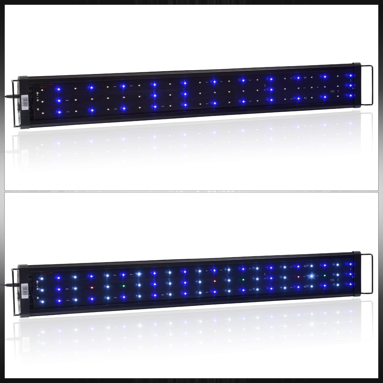 This upgraded colorful full spectrum 0.5W LED aquarium light with expendable brackets is great for your aquarium tanks. Not only does it help algaes grow more luxuriant, but it also enhances your aquatic plants to have more vivid color - adding even more ornamental value to your aquarium tanks.Features:66 LEDs with 4 Colors: Full-spectrum, super bright, energy efficient, and long lasting LEDs which produces an amazing vivid shimmer for your aquarium.Adjustable Mounting Legs: Extendable brackets allow for flexibility in fitting a variety of aquarium tanks with widths ranging from 35 inches to 41 inches.Durable Design: Constructed from an aluminum alloy shell for faster heat dissipation while providing a much more durable body than those made of plastic. High-quality LEDs can be used for at least 50,000 hours.Applications: Suitable for both freshwater or saltwater tanks, and low-to-high light level aquarium plants. It is strongly recommended to use over a glass aquarium cover or acrylic canopy top. Do not use over "open" water.3 Optional Lighting Modes: All LED Lights On.Only Blue LED Lights On.All Lights Off.Specifications:35" to 41" AquariumWhite LED - 33 Pieces (10000K 0.5W)Blue LED - 27 Pieces (460NM 0.5W)Red LED - 3 Pieces (625NM)Green LED - 3 Pieces (625NM)Lumen - 3420Extendable Bracker Length: 5 InchesSize Of Light: 33.5" x 4.5" x 0.5"