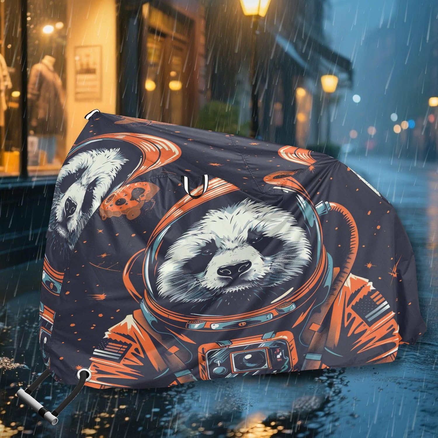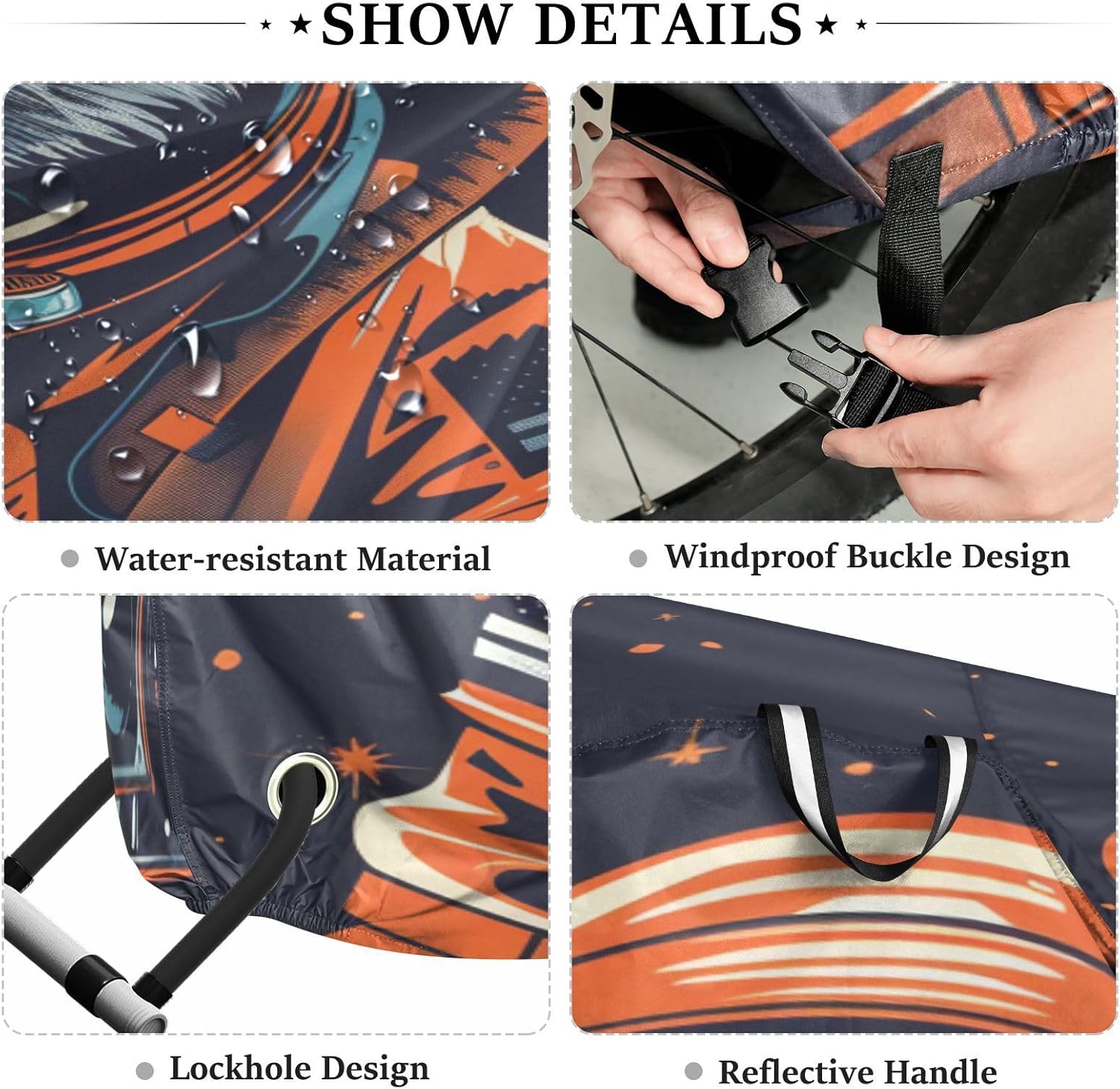 Protect your bicycle in style with our premium bike tarp, engineered for maximum defense against harsh elements. Unlike basic covers, we use specially engineered umbrella waterproof fabric - the same advanced material used in high-end rain umbrellas - delivering superior performance with unique visual appeal. Sun & Heat Defense Our fabric creates a physical cooling barrier that actively lowers your bike's temperature by: Blocking 95%+ harmful UV rays to prevent paint fading Providing exceptional shading & heat insulation (up to 20℉/11℃ reduction vs direct sun) Offering SPF 50+ equivalent protection for sensitive components Rain & Dust Protection Water-repellent coating causes rain to bead and roll off Tightly woven fabric acts as dustproof barrier for long-term storage Prevents moisture buildup with breathable side panels (prevents condensation) User-Focused Design LOCK ACCESS HOLE at front wheel enables secure locking without removing cover ADJUSTABLE BUCKLE STRAP at rear wheel anchors cover during strong winds Reflective safety strips on handles enhance nighttime visibility Ultra-lightweight (23 oz) folds into included pouch Unbeatable Aesthetics Choose from over 1,000 designer patterns - from sleek geometrics to vibrant nature motifs - transforming your bike into a street-style statement while competitors offer only solid colors.