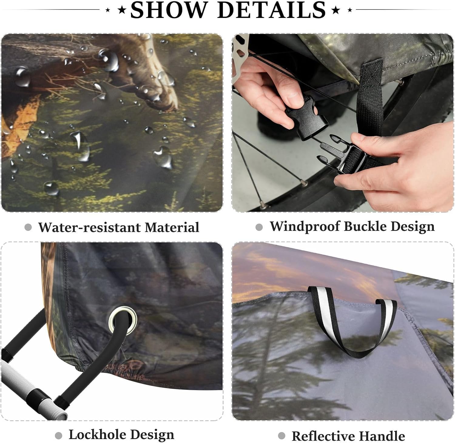 Protect your bicycle in style with our premium bike tarp, engineered for maximum defense against harsh elements. Unlike basic covers, we use specially engineered umbrella waterproof fabric - the same advanced material used in high-end rain umbrellas - delivering superior performance with unique visual appeal. Sun & Heat Defense Our fabric creates a physical cooling barrier that actively lowers your bike's temperature by: Blocking 95%+ harmful UV rays to prevent paint fading Providing exceptional shading & heat insulation (up to 20℉/11℃ reduction vs direct sun) Offering SPF 50+ equivalent protection for sensitive components Rain & Dust Protection Water-repellent coating causes rain to bead and roll off Tightly woven fabric acts as dustproof barrier for long-term storage Prevents moisture buildup with breathable side panels (prevents condensation) User-Focused Design LOCK ACCESS HOLE at front wheel enables secure locking without removing cover ADJUSTABLE BUCKLE STRAP at rear wheel anchors cover during strong winds Reflective safety strips on handles enhance nighttime visibility Ultra-lightweight (23 oz) folds into included pouch Unbeatable Aesthetics Choose from over 1,000 designer patterns - from sleek geometrics to vibrant nature motifs - transforming your bike into a street-style statement while competitors offer only solid colors.