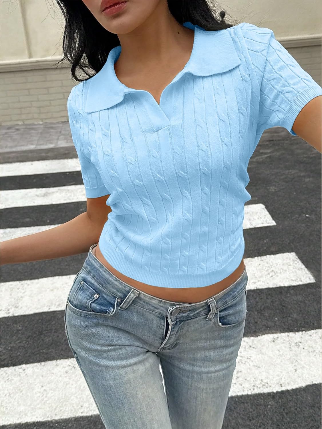 Elevate your summer wardrobe with this short-sleeve cable knit sweater polo crop top. Drawing inspiration from the Y2K era and the refined old money aesthetic, this piece seamlessly blends nostalgia with contemporary fashion. The intricate cable knit design adds texture and depth, while the cropped silhouette ensures a modern fit. The polo collar introduces a preppy touch, making it versatile for both casual and semi-formal settings. Perfect for those who appreciate minimalist luxury, this top is a nod to the '90s and 2000s fashion trends, reminiscent of iconic styles seen in teen dramas and fashion magazines of the era. High-Waisted Jeans: For a casual, everyday look. Pleated Mini Skirts: To channel the classic schoolgirl aesthetic. Tailored Shorts: Ideal for summer outings or brunch dates. Whether you're heading to a party, a day at the mall, or just lounging with friends, this top ensures you do so in style.