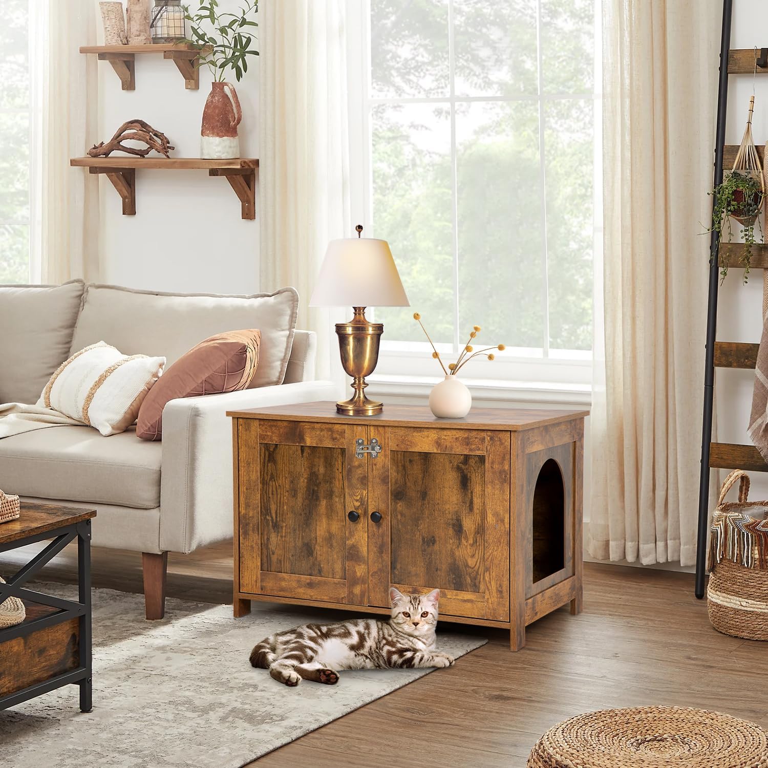 This cat litter box furniture serves as an attractive cover to hide away the cat litter box and confines all the litter mess inside, while providing useful space for many organizing options. It is designed to fit any size litter box, including the extra-large automatic litter boxes. It comes with a removable partition wall creating a space to store litter, scoop and other supplies.