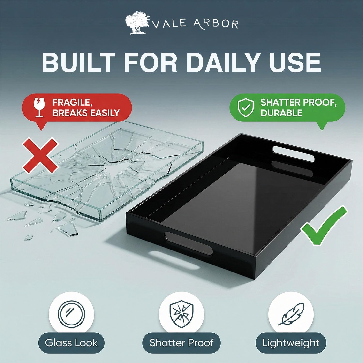 The Vale Arbor black acrylic serving trays are crafted from tough dura-strong acrylic plastic. The timeless all-season design compliments your home or office in many ways: - Use the Vale Arbor black acrylic tray for serving beverages or food such as coffee, tea, breakfast, lunch, dinner, appetizers, cheese, wine, fruit, and much more. - Use it as an organizer in your bathroom, bedroom, kitchen, office, bar, entryway or table. - Use it for jewelry, cosmetics, or toiletries. - Use it to add a stunning look to the décor of your home by accenting tables, dressers, and countertops. - Use it for hobbies like puzzles, arts and crafts, sewing, scrapbooking, and more. The dimensions are 20 inches wide x 12 inches deep and 2 inches tall. 220 square inches of space for accessorizing your home or transporting beverages or food for your guests. By adding the Vale Arbor Black Serving Tray to your home you can own a timeless piece of home décor that is as versatile as it is beautiful. Order today, you won’t regret it! ***CAUTION: Never use window cleaner, ammonia products, or other chemical sprays on acrylic.Use a soft clean damp cloth when cleaning acrylic surfaces. It is possible to scratch acrylic, so NEVER use any scouring compounds or chemical cleaners (no Windex or other glass cleaners (even if they are environmentally friendly, organic or non-scented)). Do not use any specialty solvents to remove stickiness or glue.