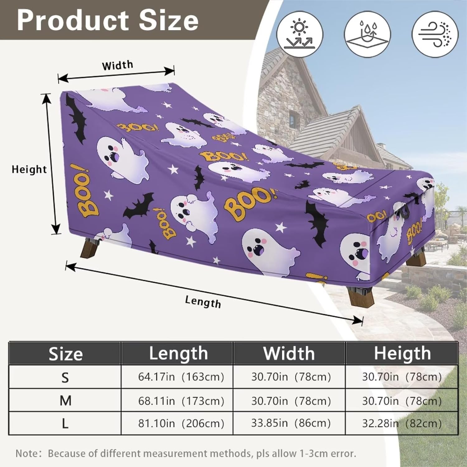 Size for lounge chair cover: S(64.17" L x 30.7" W x 30.7" H) M(68.11" L x 30.7" W x 30.7" H) L(81.1" L x 33.85" W x 32.28" H) Feature: 1.Waterproof & UV Protection 2.Heavy Duty 3.Drawstring and Buckle 4.Easy To Clean 5.A Variety of Pattern Design Kindly Note:Make sure to check and measure your furniture shape or size first to determine the proper cover size