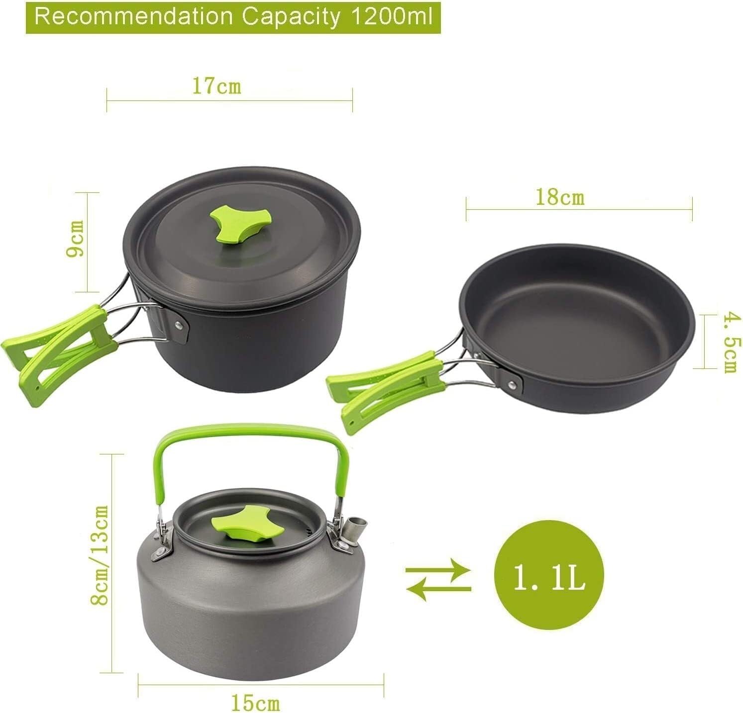 Multi-purpose cookware: It is your go-to tool for cooking a variety of dishes and is easy to maintain. It can withstand the rigors of outdoor cooking and is a must-have for your outdoor gear collection whether you are camping, hiking, backpacking or picnicking.Product Name: camping cookwareMaterial: aluminum alloyColor: black, green, orangeWeight: 810gApplicable environment: hiking, camping, picnicApplicable number of people: 2-3people1*camping cookware setReminder: Due to different display resolutions, there will be slight differences.Manual size measurement, the error is 2 cm-3 cm is normal, I hope to understand!Easy to carry in a backpack: Whether you are on a short hike or a long camping trip, our portable cooking solutions can save space and reduce your burden.Enjoy cooking fun anytime, anywhere: Outdoor cooking allows you to maintain energy from alpine adventures to weekend hiking, designed for those who love outdoor camping, backpacking, hiking and sharing outdoor picnics with loved ones.