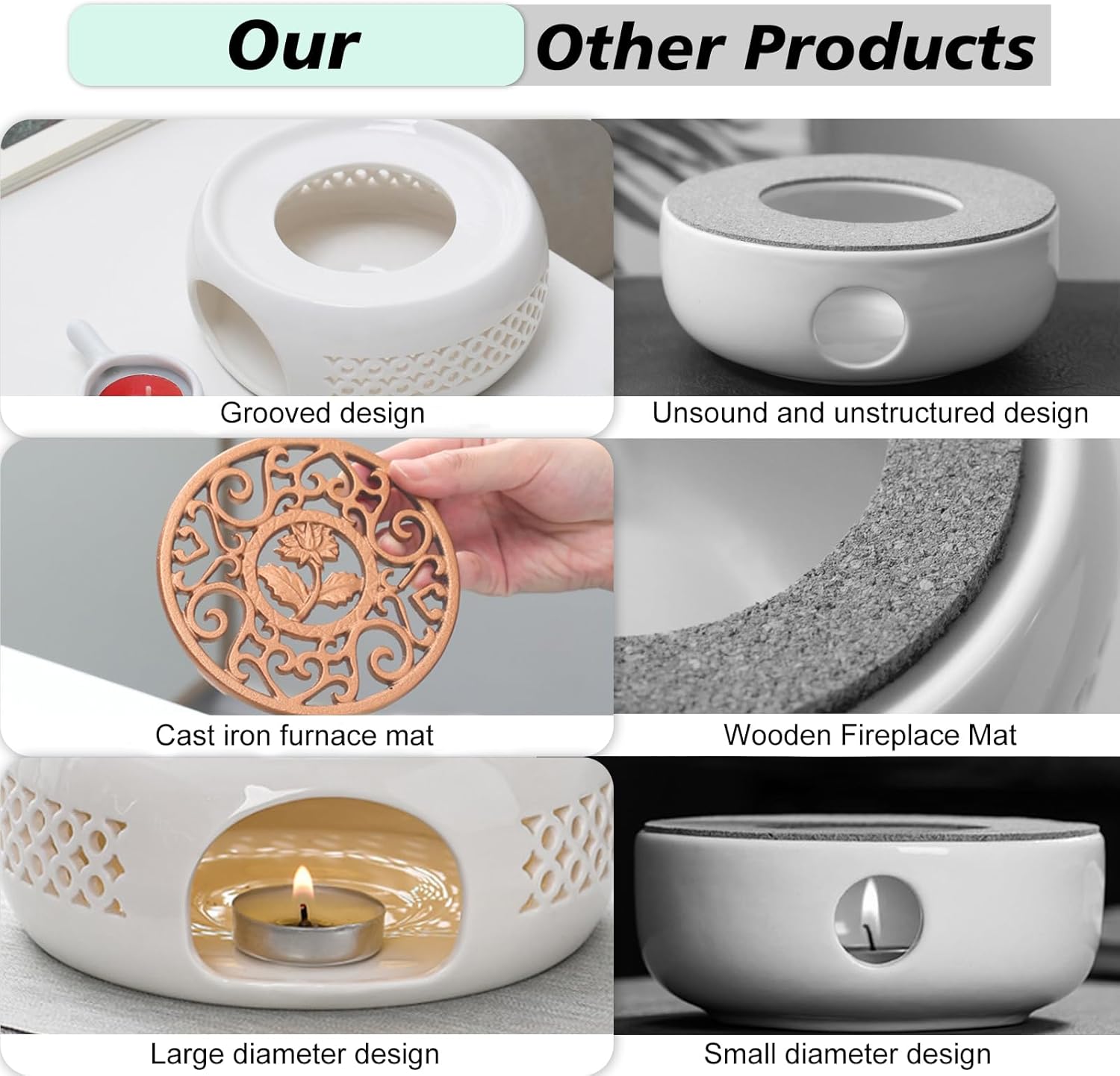 Product features: High quality Tilizan ceramic teapot warmer is made of delicate porcelain, has strong heating power, strong and durable. Cast iron stove mat can prevent the teapot from colliding with the heater to protect your teapot well. Package includes 1 * ceramic teapot heater, 1 * cast iron stove mat from golden and 1 * spoon. Practical heat retention Tilizan Ceramic Teapot Warmer equipped with a spoon, candles can be easily inserted and taken out, just place a lit candle in the middle of the warmer and rest the teapot on it. Our teapot warmer keeps your tea, food and coffee warmer for longer and is compatible with stainless steel teapots, borosilicate glass and other materials. Specifications: Product Name: Tilizan Ceramic Teapot Warmer Material: Ceramic, Cast Iron measure: 14.5*6cm Colour: white. NOTES: 1. Si vous n'êtes pas satisfait de la qualité de nos produits, veuillez contacter notre service client et nous résoudrons le problème dans les plus brefs délais. 2. Les photos du produit sont prises à partir du produit réel. Des erreurs de couleur peuvent survenir en raison des différences entre les écrans d'ordinateur ou les angles de prise de vue. 3. En raison de la mesure manuelle, il peut y avoir une erreur de 1 à 3 cm. Merci pour votre soutien à nos produits.