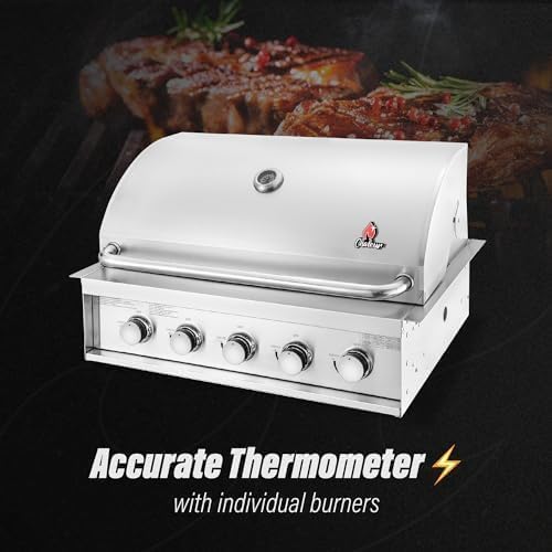 Chaleur 33" Essential Line Gas Grill: High-Capacity Built-In ExcellenceElevate your outdoor kitchen with the Chaleur 33" Essential Line Gas Grill 5 Burners, a stainless steel built-in natural gas powerhouse for professional BBQ. Featuring individual burners (50,000 BTU total est.), built-in thermometer and 600°F max heat, it masters searing steaks, burgers, ribs, chicken, pork chops, veggies and seafood with even distribution and steakhouse-quality results. Premium 304 stainless construction delivers durability for daily use or large gatherings.5 Individual Burners for Ultimate VersatilityEach high-output burner operates independently (10,000 BTU each est.), enabling multiple cooking zones – high-heat sear steaks while indirect-roasting chicken or warming sides. Expansive 630 sq in cooking area handles 25+ burgers, ideal for parties or family feasts. Manual piezo ignition ensures reliable starts every time.Built-In Thermometer for Precise 600°F PerformanceIntegrated hood thermometer provides accurate real-time readings up to 600°F, guaranteeing consistent grilling without guesswork – juicy interiors with perfect crust on ribs or fish. 33-inch width fits standard large cutouts (32.2 x 19.6 x 8.66 in), with heavy stainless grates retaining heat for superior marks.304 Stainless Steel Premium BuildFull 304 stainless steel body, tubular burners, flame tamers, grates, warming rack and hood handle resist rust and high-heat abuse for years. Ergonomic zinc alloy knobs offer smooth control, while drip tray system manages grease efficiently for cleaner operation.Effortless Installation and MaintenanceNatural gas ready with brass fittings for seamless built-in outdoor kitchen integration; propane convertible. Removable grates, warming rack and accessible drip tray simplify post-grill cleanup – scrape, wipe and empty in minutes. Wind-resistant design maintains flame stability outdoors.Designed for Entertaining and Pro KitchensFrom everyday dinners to catering events, 5 burners support complex menus like grilled asparagus alongside pork tenderloin. Enthusiasts praise rapid preheat, uniform heat and robust build over entry-level grills. Maximize your space with high-capacity performance.Why Choose the Chaleur 33" Essential Line 5-Burner Grill?Pro-grade power: 5 independent burners, 600°F thermometer accuracy, all-304 stainless durability and easy maintenance for elite outdoor kitchens. Perfect for serious grillers craving volume and precision. Search "Chaleur 33 Essential gas grill 5 burners", "stainless steel built-in natural gas grill outdoor kitchen", "Chaleur 5 burner BBQ 600F" to discover yours!