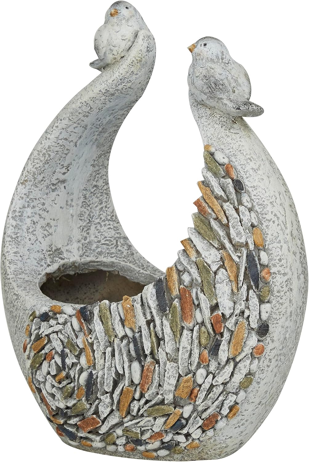 This item features a wide setting pot with a playful structure making a an inviting sculpture in any space. Add a splash of personality with a charming appeal into your outdoor setting. Large bird planter pot versatile design makes it perfect for both indoor locations like a living room and outdoor locations like a patio, enhancing the beauty of any space it occupies. This item ships in 1 carton. Please note that this item is for decorative purposes only and is not food safe. Fiberglass planter makes a great gift for any occasion. Suitable for indoor and outdoor use. This item ships fully assembled in one piece. Maximum weight limit is 5 lbs. This planter does not have drainage holes. This is a single gray colored plant pot. Traditional style.
