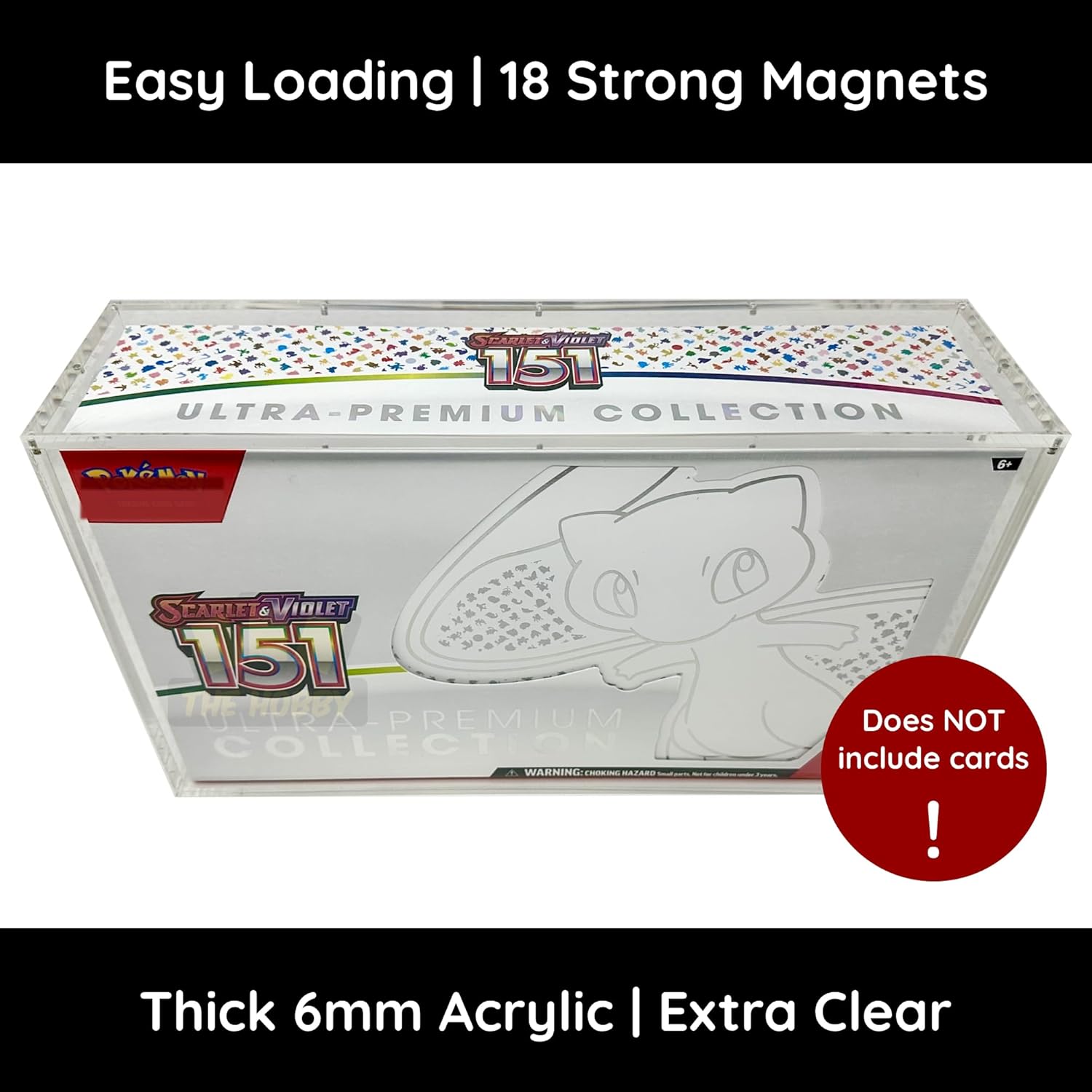 PREMIUM ACRYLIC CASE ONLY. CARDS NOT INCLUDED! Display and protect your Mew 151 UPC in a premium UV-protected acrylic display. Compatible ONLY with the Mew 151 UPC NOT the Celebrations UPC OR the Zard UPC. The ultra clear, thick acrylic display box features a 2-piece top-opening design with a secure sliding top with a magnetic lock, perfect for keeping your collectible extra safe. Each display includes optional rubber feet attachments and a cleaning cloth. Made with non-PVC, acid free materials for premium protection. NOTE: Extra strength glue may have an odor for a few hours after opening - this develops naturally during the curing process and is not harmful or toxic.