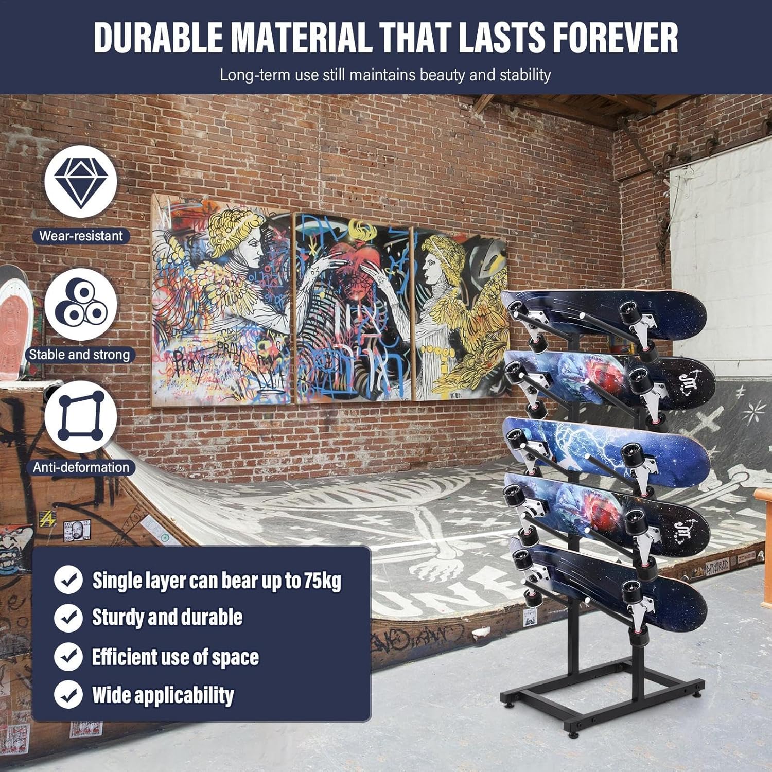 The skateboard organizer is here! Place snowboards with ease with this large capacity display rack. It's easy to assemble with no tools required. Not only is it stable and strong, but it also doesn't fold. Keep your space organized and stylish with this skateboard organizer.Product name: Single-sided 5-layer skateboard display rackProduct size: 110x30x4 cm/43.3x11.8x1.5inProduct net weight: 4500gPackaging size: 112x32x6 cm/44.0x12.5x2.3inPackaging weight: 5000gMaterial: IronList:Snowboard Storage Rack x1Fixing rod x10Tripod x4Paper Box x1