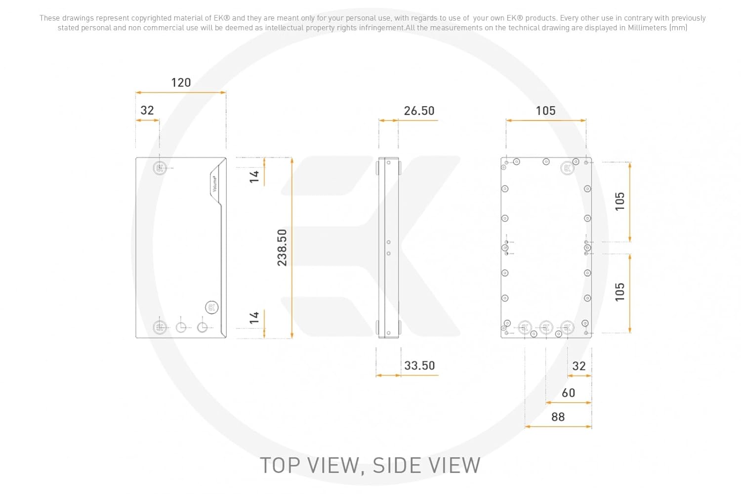 This next-generation EK-Quantum Volume 3 FLT reservoirs build on the success of the existing FLT, flat-style reservoirs further improves compatibility, and simplifies the installation process by implementing additional G1/4“ connection ports. The reservoir features standard 120mm fan mounting holes for maximum flexibility during the installation. The reservoir is equipped with a total of six G1/4“ ports so that users can choose the most optimal setup for their liquid cooling loops. The new Volume 3 flat-shaped reservoirs are to revolutionize the way you were thinking about loop building. Since 120mm fan mounting patterns (105mm apart) are the most dominant mounting options inside PC cases these days, these new Volume FLT reservoirs will allow greater flexibility for installation since they don't require drilling of mounting holes on your case. Technical specifications: - Size (HxWxT): 138.5 x 128 x 40mm - Capacity: ~250ml - D-RGB connector 3-pin 5V digital LED header (Pinout: +5V, D, Blocked, Ground) - LED Count: 27 Model: 3831109880777