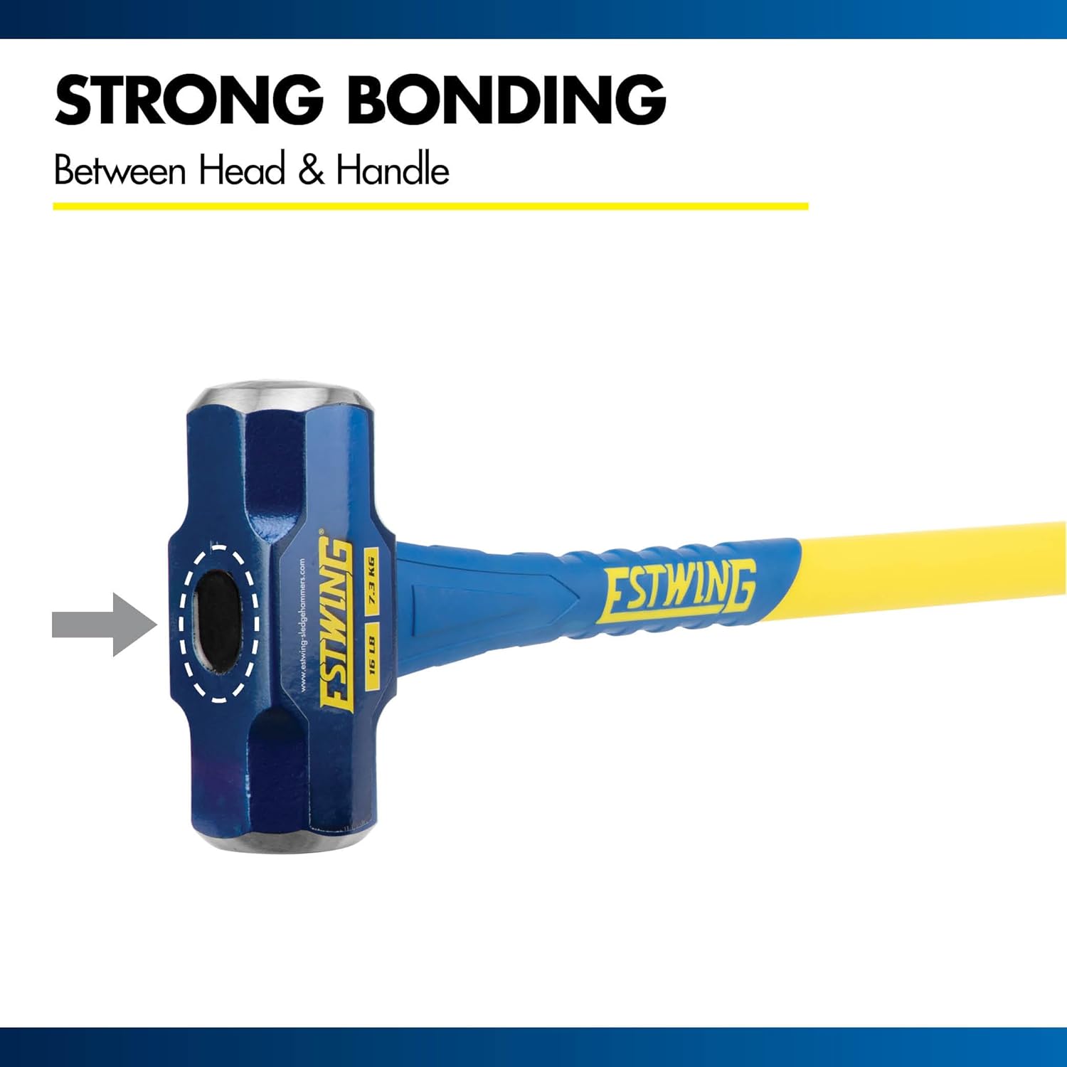 Drive stakes and rebar, shatter stone and concrete, and perform heavy demolition or industrial construction projects with the hard hitting power of this Estwing sledge hammer. Designed and built for heavy-duty use, this hammer features a 16 lb. forged alloy steel head with striking ends hardened to 50-55 HRC to withstand years of repeated impacts without deforming. This head is mounted to a 36-inch long, fiberglass handle that is double injected for increased strength and durability. A textured rubber overlay on the handle provides a comfortable, ergonomic, and secure grip in both grip positions while also helping to dampen vibrations. Below the striking head the handle and rubber overlay are thicker to provide increased overstrike protection to prevent damage from missed hits.