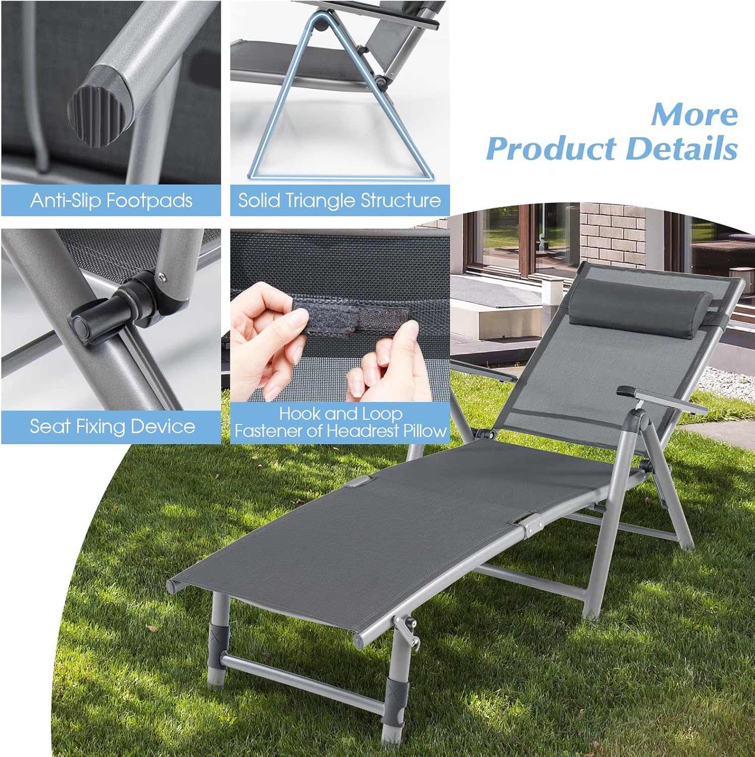 Description: This adjustable patio chaise lounge allows you relax with comfort and ease outdoors. 8-level adjustable backrest enables you to sit or recline for relaxation, satisfying your multiple demands. The fabric of seat and back is breathable, making you feel cool even in hot days. And the wide and long sitting area with comfortable backrest and armrest brings you much coziness to relax. The chaise lounge is also of high stability with the reinforced and rustproof aluminum frame. And the triangle structure on the two sides highly increases the overall stability. Additionally, the non-slip footpads will protect the ground from scratches. When finishing using, you can fold the chaise lounge into a compact for storage. The patio chaise lounge will be your perfect companion during outdoor leisure time. Features: 8-position adjustable backrest satisfies your different demands Wide seat with high backrest and comfortable armrest for more comfort Breathable seat fabric keeps your way from hotness Removable and adjustable headrest pillow makes your more relaxed Wearable and rip-resistant fabric for long service life Aluminum frame is sturdy, rustproof and lightweight Triangle structure on the two side improves the stability Anti-slip footpads protect the ground from scratches Ideal for poolside, backyard, balcony and so on No need to assemble, saving much of your effort Specifications: Color: Black Material: Fabric, Aluminum Overall Dimension of Unfolding: 71''/68.5''/66''/64.5''/62.5''/59''/57''/53.5''L x 26.5''W x 27.5''/29''/31''/33''/34.5''/36''/37''/37.5''H Overall Dimension of Folding: 29'' x 26.5'' x 7.5'' (L x W x H) Seat Height from the Ground: 12'' Dimension of Pillow: 16'' x 6.5'' x 2.5'' (L x W x Thickness) Net Weight: 15 lbs Weight Capacity: 240 lbs Package Includes: 2 x Chaise Lounge 2 x Headrest 1 x Instruction