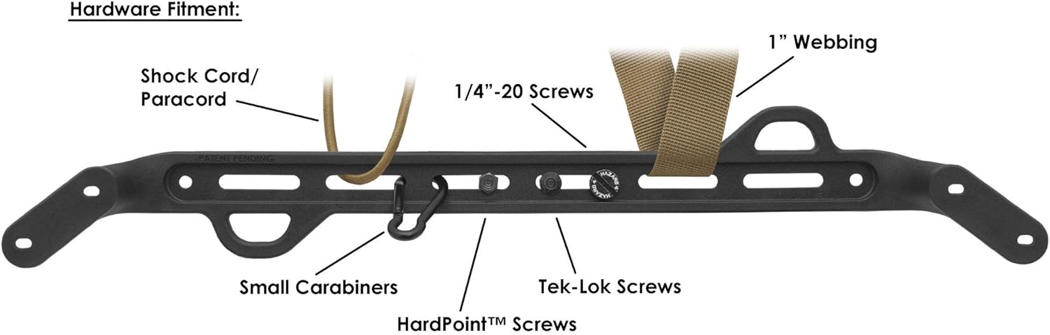 These patent pending Hazard 4(R) exclusive add-on's to our shell packs allow for the rock solid mounting of hardware and loads thereby expanding the usability of the pack shell greatly. They screw into the top and bottom HardPoint(R) grommets (screws and backers not included) and will allow the strapping down of helmets, skateboards, firearms, jackets, etc. between them using our optional bungee cords, 1" straps, paracord, etc. This is done by the variety of thoughtful slots and holes molded into the tough nylon construction. The slots are also designed to work with popular holster screw systems for the attaching of various index, nylon and leather holsters for knives, machetes, axes, radios, magazines, etc. The various holes and slots can accommodate photographic 1/4 20" screws to mount action cameras, articulating arms, lights, external battery packs, etc. And the relief groove on the back means that the screws or nuts will not stick out the bottom or catch on anything. Use our separately sold HardPoint(R) Screw & Nut Set and HardPoint(R) Stop Gap to screw into hard point system holes (requires 8 screws & 4 backers).