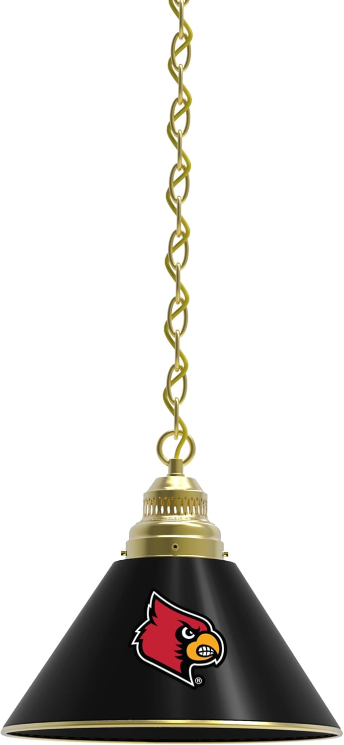 This Single Shade University of Louisville Pendant Light by Holland Bar Stool will certainly brighten up your space. Whether above your pool table, game table, bar, or wherever you need extra light, this classic is sure to impress. Included is 4’ of chain for hanging, ceiling mounting fixture, and 5’ of cord with a 3-pronged polarized plug. Light fixture is vented to allow heat to escape instead of building around the socket, prolonging bulb life. Decorative molding accent trim on shade rim to match fixture. Lights are UL approved. Brighten up your game room with a classic billiard light from Holland Bar Stool Co.