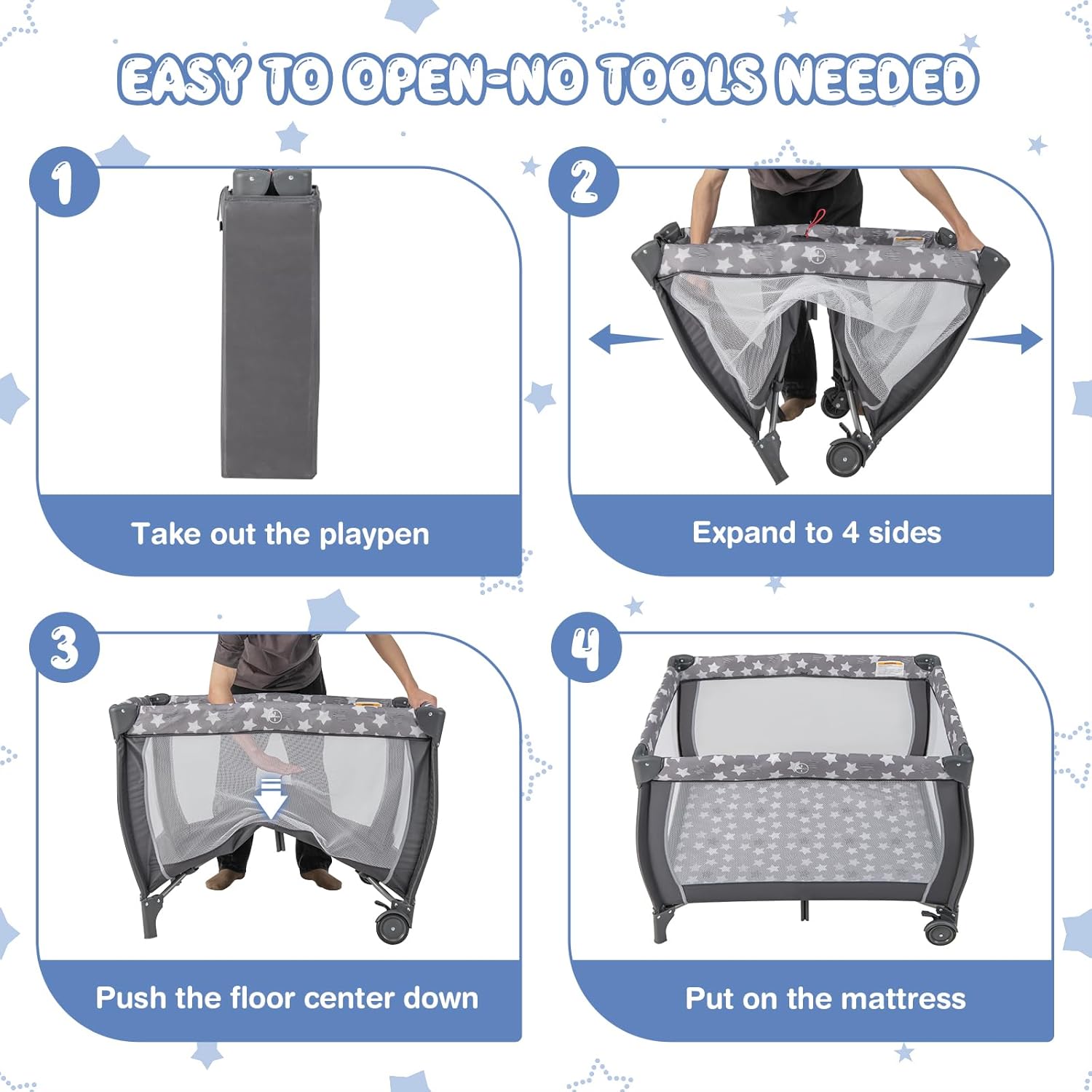 Description: Make child care a breeze with this folding baby nursery center! The foldable baby play yard is equipped with a diaper changer and a full-size bassinet, accompanying the baby to grow up. Besides, the premium Oxford fabric and sturdy metal frame ensure durability and stability. Through the visible and breathable mesh, you are able to know about the baby’s status. With a comfy mattress, the kid has a sound and sweet slumber. In addition, the adorable toys and interesting music box make this portable baby playpen more appealing to infants. When you need to move the foldable baby playard, the smooth wheels help a lot. Furthermore, it is super easy to open or fold this multifunctional nursery center. With the convenient carry bag, you can take it everywhere you go. Features: Convertible baby playard with a full-size bassinet and changing table Water resistant and easy cleaning diaper changer for convenience Cozy and foldable mattress with hook and loop fasteners for comfort Visible and breathable mesh for safe and easy use Intriguing toys and music box for enhanced fun Side storage bag for various baby’s belongings Easy to fold or open for convenient use Lockable universal wheels for easy movement Handy carry bag for simple transportation Suitable for babies from 0 to 36 months ASTM and CPSIA certifications for more reliability Specifications: Color: Grey Materials: Oxford Fabric, Metal Product Dimension: 40” x 28.5” x 29” (L x W x H) Size of Diaper Storage Bag: 7.5” x 5.5” x 15.5” (L x W x H) Size of Carry Bag: 30.5” x 8.5” x 9” (L x W x H) Mattress Size: 38" x 26.5" (L x W) Recommended Ages: 0-36 Months Old Net Weight: 22 lbs Weight Capacity of Changing Table: 20 lbs Weight Capacity of Baby Bassinet: 20 lbs Weight Capacity of Baby Playard: 33 lbs Package Includes: 1 x Baby Nursery Center 1 x Mattress 1 x Toy Bar 1 x Music Box 1 x Carry Bag 1 x Instruction