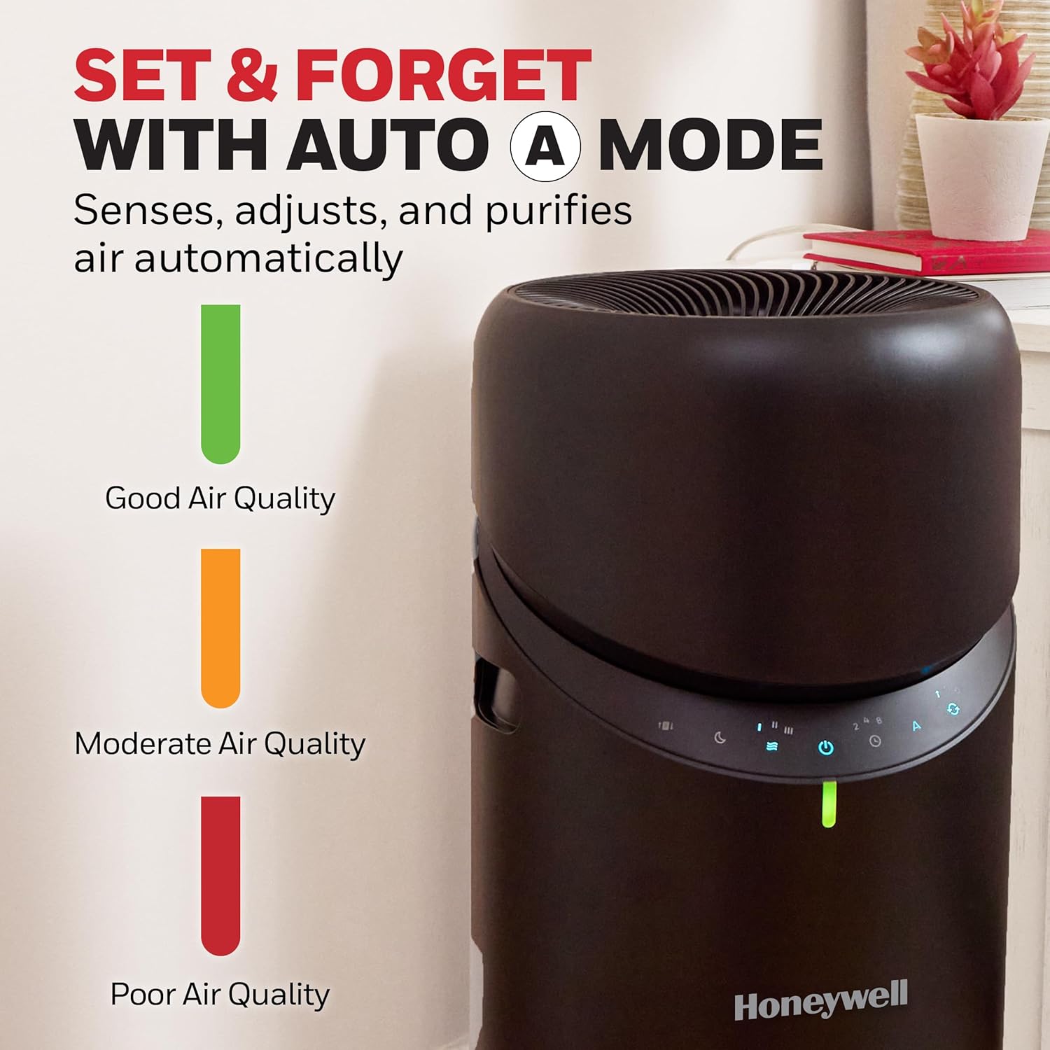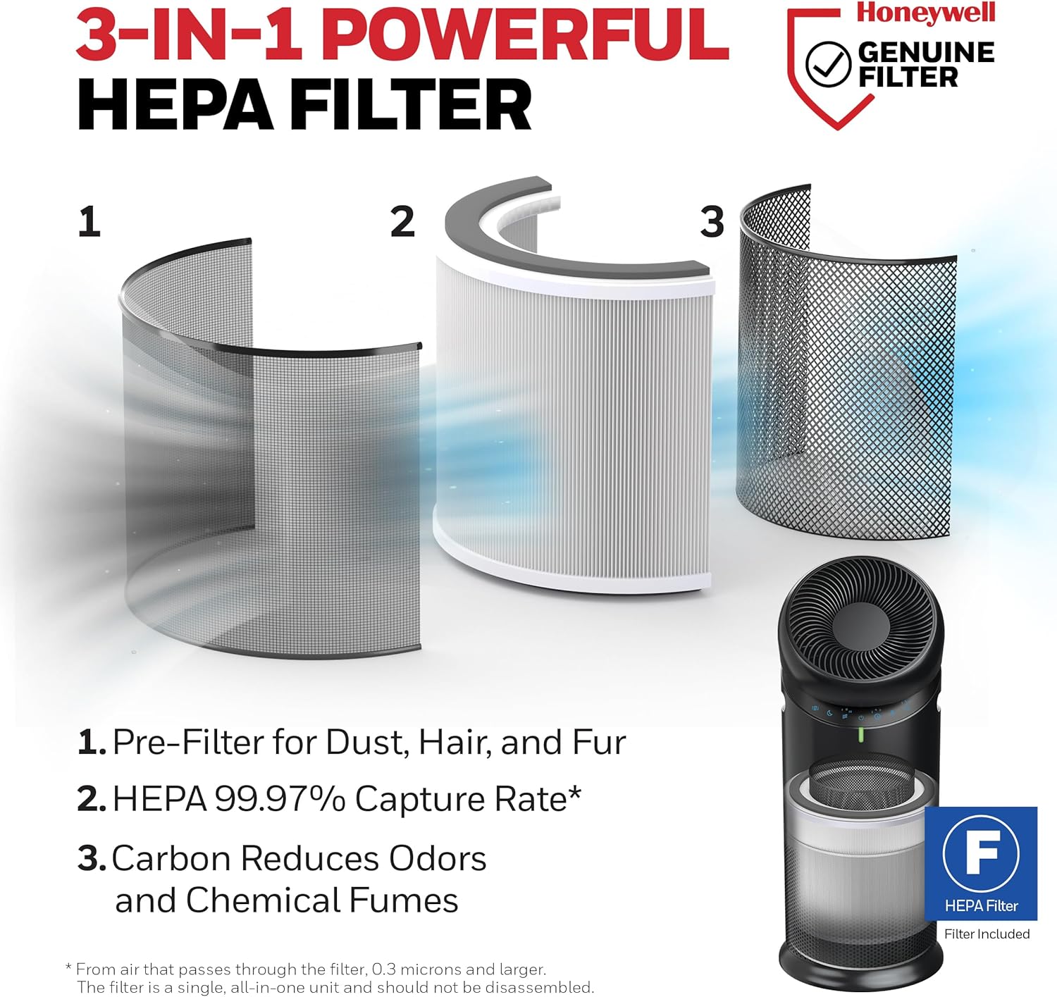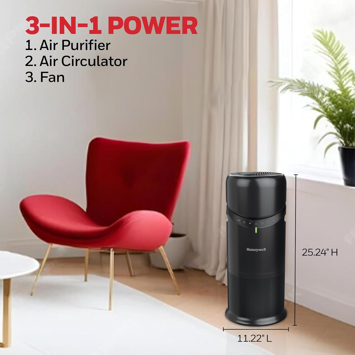The Honeywell Allergen Plus HPA6000 3-in-1 HEPA Air Purifier, Fan, and Circulator is engineered to improve indoor air quality in large rooms. With a powerful Turbo360™ swivel fan and 360° air circulation, it delivers HEPA-filtered air across spaces up to 1928 sq. ft. at 1 air change per hour. Its three-stage filtration system includes a cleanable pre-filter for dust and pet hair, a certified HEPA filter that captures up to 99.97% of airborne allergens like pollen and smoke, and a carbon filter that helps reduce odors and VOCs in the air like household cleaners and air fresheners. Designed for year-round comfort, the HPA6000 features intuitive air quality monitoring, a capacitive touch panel, and a quiet sleep mode. Whether you're managing allergy season, wildfire smoke, or everyday indoor pollutants, this air purifier is ideal for bedrooms, living rooms, and home offices. AHAM verified for 398 sq. ft. with 4.8 air changes per hour, it’s a reliable solution for cleaner, fresher air. These units are independently tested and include a 5-year limited warranty. With Honeywell Air Purifiers, you can trust the air you breathe.