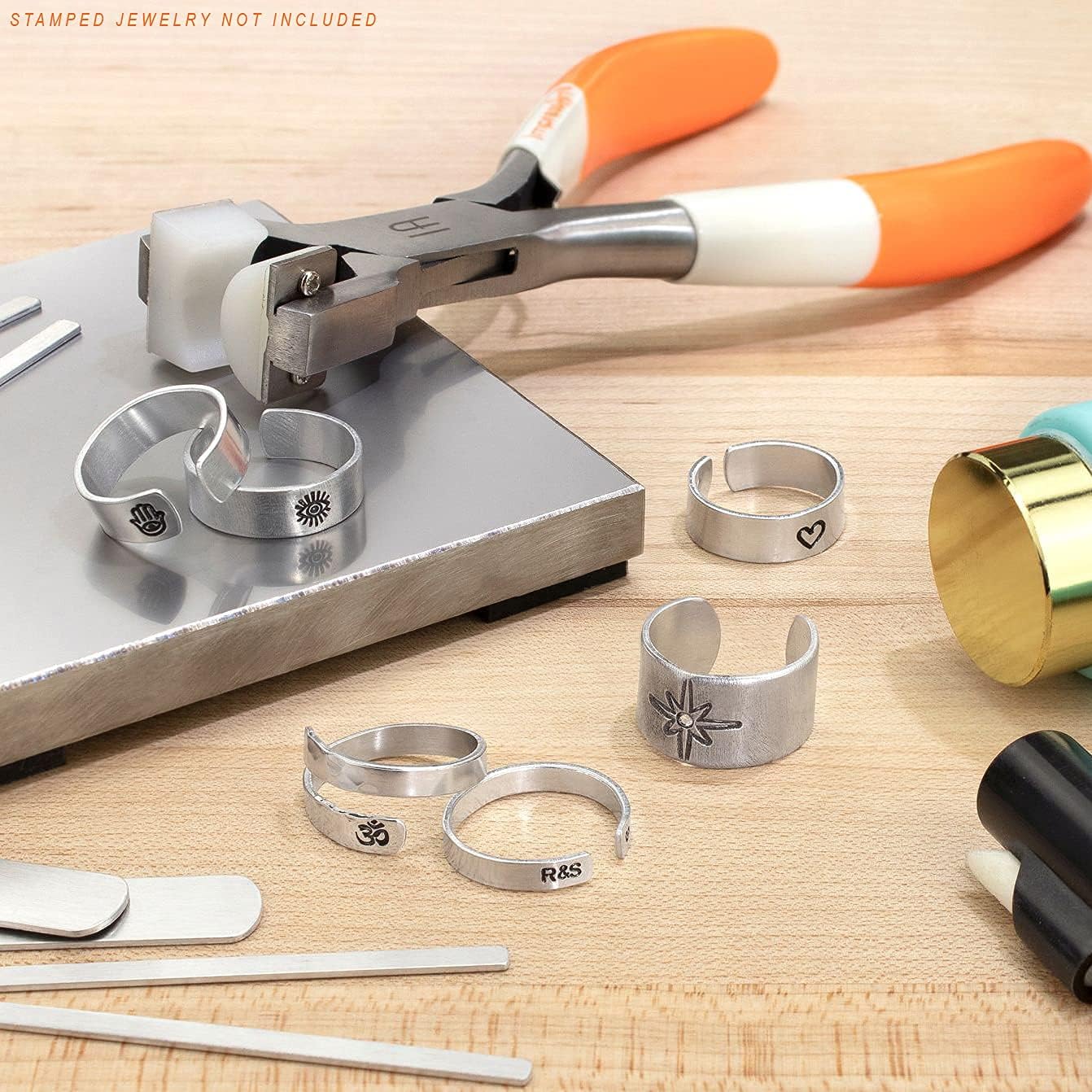 Ring Making Kit for Jewelry Making, Bending and Wrapping Metal Tool Includes 8 Metal Ring BlanksThis budget-friendly kit includes the essential tools needed to start hand stamping metal jewelry and keepsakes. The stamps and tools are all specifically chosen to ensure an easy and successful introductory experience.Ring Bending Pliers easily bend, form, and reshape ring stamping blanks and metal strips. Also can be used to make curves in other soft, low-gauge metals.Add a spark of color to your hand-stamped pieces using ImpressArt’s Crystal Setter Kit with birthstone-colored crystals.Kit Includes: Crystal Setter Kit, G-S Hypo (Jewelry Glue), Ring Bending Kit & TweezersIncludes: 216 Birthstone Crystals – 72 of each size (12 colors) - Garnet, Amethyst, Aquamarine, Diamond, Emerald, Alexandrite, Ruby, Peridot, Sapphire, Tourmaline, Topaz, Zircon Kit Includes: 3 Crystal Metal Stamps/Punches – 1.8mm, 2.5mm, and 4mmHow To Use: Hold crystal setter flush on blank. Strike with medium force until a round indentation is formed on the blank. Secure flat back crystal inside stamped impression with Hypo Cement or your favorite jewelry adhesive, and allow to dry.The kit also includes 8 ring blanks, 4 keychain projects, a practice blank, stamp guides, and a stamp enamel sample.