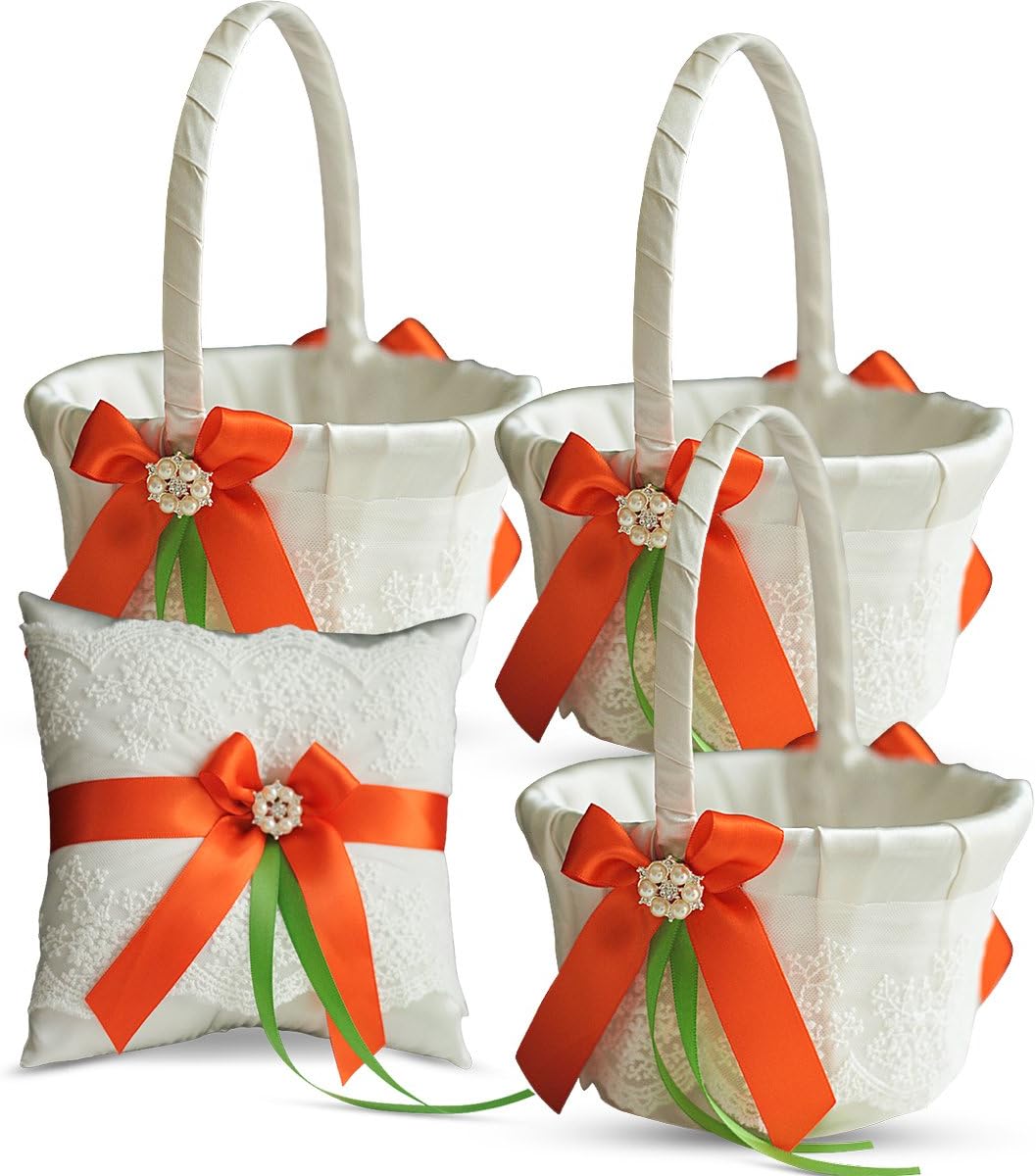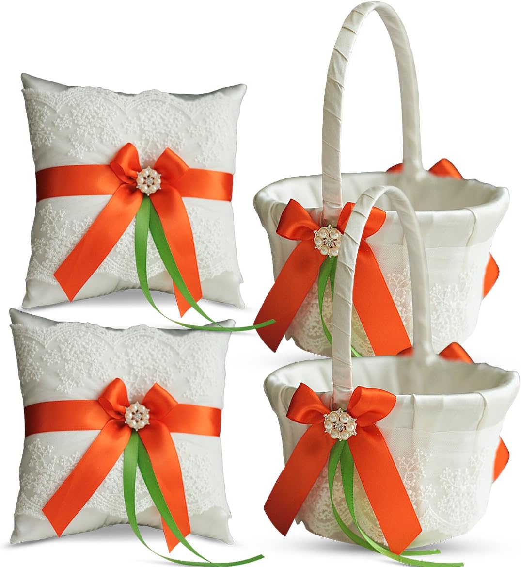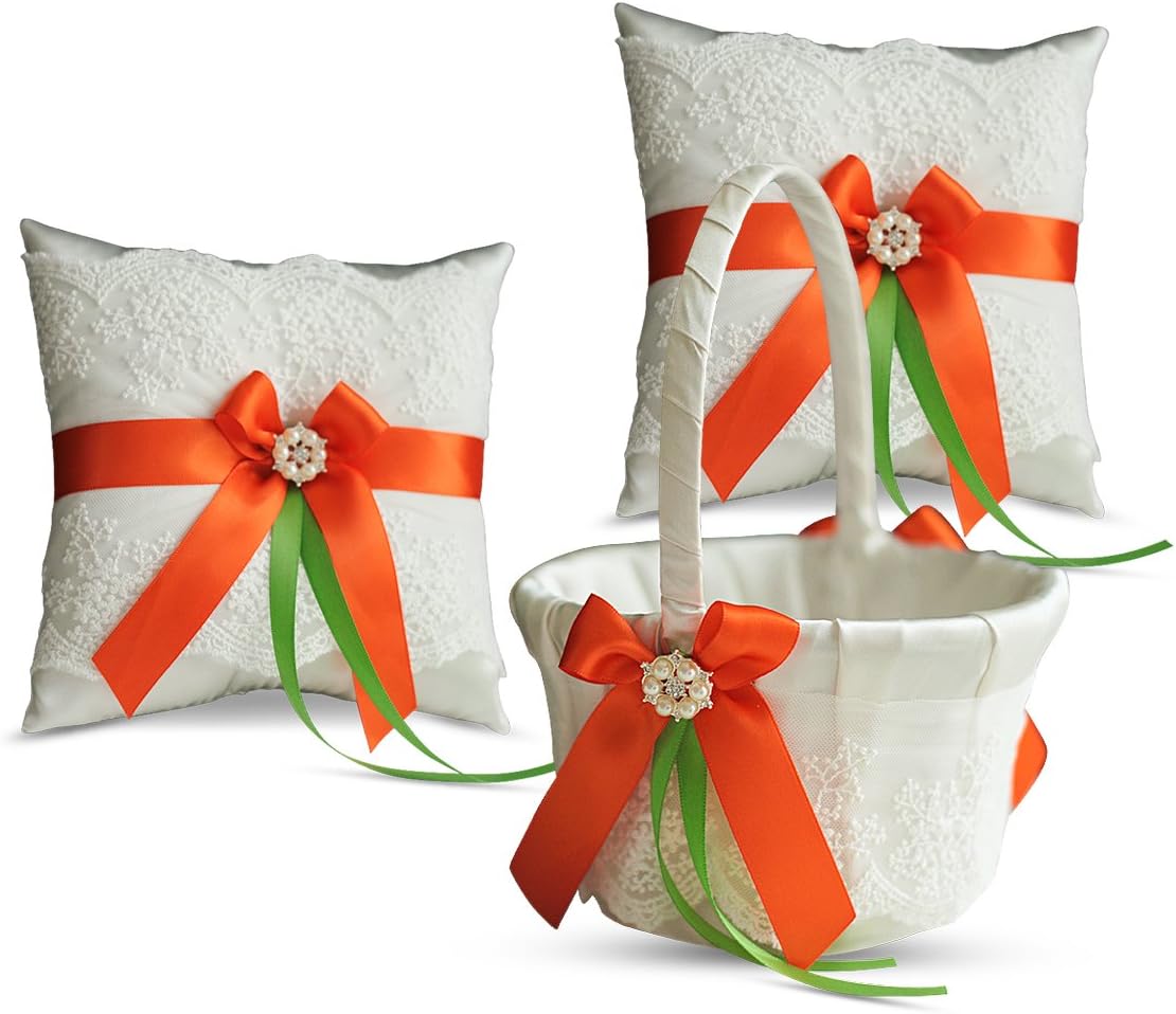 Ivory Ring Bearer Pillow and Basket Set | Lace Collection | Flower Girl & Welcome Basket for Guest | Handmade Wedding Baskets & Pillows (Orange Lime)