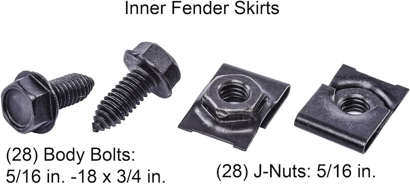 Front End Bolt Kit1970-1981 Chevy Camaro, Pontiac FirebirdBlack Finish - Matching Original Equipment (OE)142-Piece Kit JEGS 79153 Kit Includes Hardware For:Headlight Bracket, Lower Latch, Latch Brace, Fender Braces, Fender to Core Support, Top Header Panel Ends:(20) Body Bolts: 5/16 in.-18 x 3/4 in. UHL, with 1/2 in. hex washer head(4) Split Lock Washers: 5/16 in.(4) Hex Nuts: 5/16 in.-18Upper and Lower Fender Bolts to Cowl:(10) Body Bolts: 3/8 in.-16 x 1 3/16 in. UHL, with 9/16 in. hex head – head contains affixed 1 1/8 in. diameter fender washer(4) U-Nuts: 3/8 in.-16Headlight Bezels:(14) Phillips Oval Head Black Sheet Metal Screws: #8 x 3/4 in. OALInner Fender Wells:(4) Body Bolts: 5/16 in.-18 x 3/4 in. UHL, with 1/2 in. hex washer head(4) Cup Washers: 2 3/16 in. diameter x 5/16 in. depthHood Hinges: (Note: it is recommended that 1/16 in. be ground off the tip of the bolts to avoid the possibility of contact with the underside of the hood)(8) Body Bolts: 3/8 in.-16 x 7/8 in. UHL, with 9/16 in. hex head – head contains affixed 1 in. diameter fender washerFender Alignment:(4) Shims: 7/64 in. thick(4) Shims: 1/16 in. thickInner Fender Skirts:(28) Body Bolts: 5/16 in.-18 x 3/4 in. UHL, with 1/2 in. hex washer head(28) J-Nuts: 5/16 in.-18Inner Fender Brace:(6) Fender Washers: 3/64 in. thick x 1 1/2 in. diameter