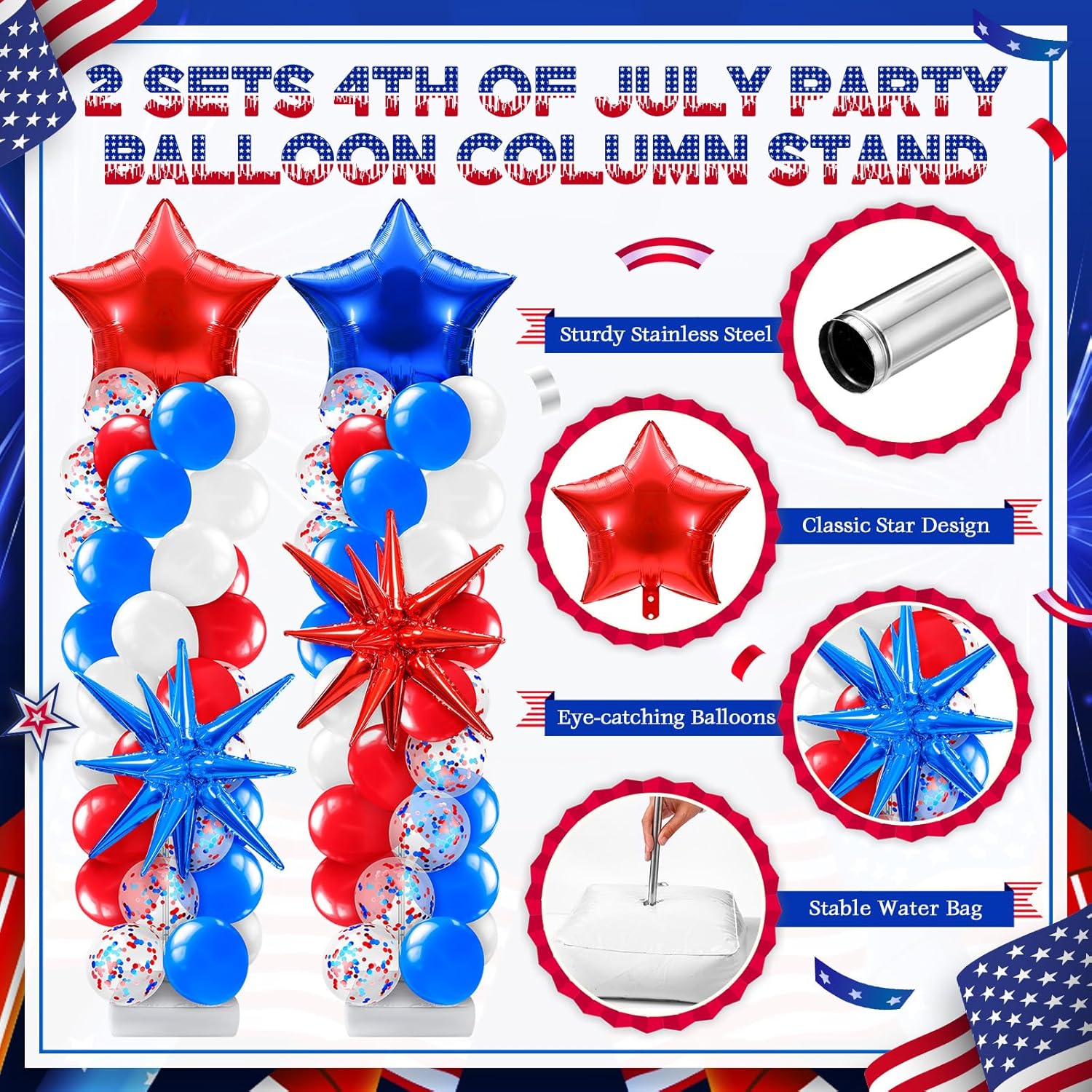 Features: The arrangement's classy red white and blue balloon garland kit style will add charm to any occasion. Never worry about your decorations falling flat, as our attractive balloon stands will keep your party upbeat and lively. The package includes two red white and blue balloon column stand kit. This provides the convenience of having everything needed in one place to put up this elegant 4th of july balloon decoration. Specifications: Material: latex and aluminum film Color: red white and blue Size: about 106.3 inches/270 cm Package includes: 2 x Column Stand Kit 2 X 4D star foil balloons 2 x Star foil balloons (1 red+ 1 blue) 100 X 12 Inch latex balloons Notes: Manual measurement, please allow slight errors on size. The color may exist a slight difference due to different screen displays. Do not overinflate the balloons to avoid bursting. Small parts included, please keep them away from little kids to avoid swallowing risk.