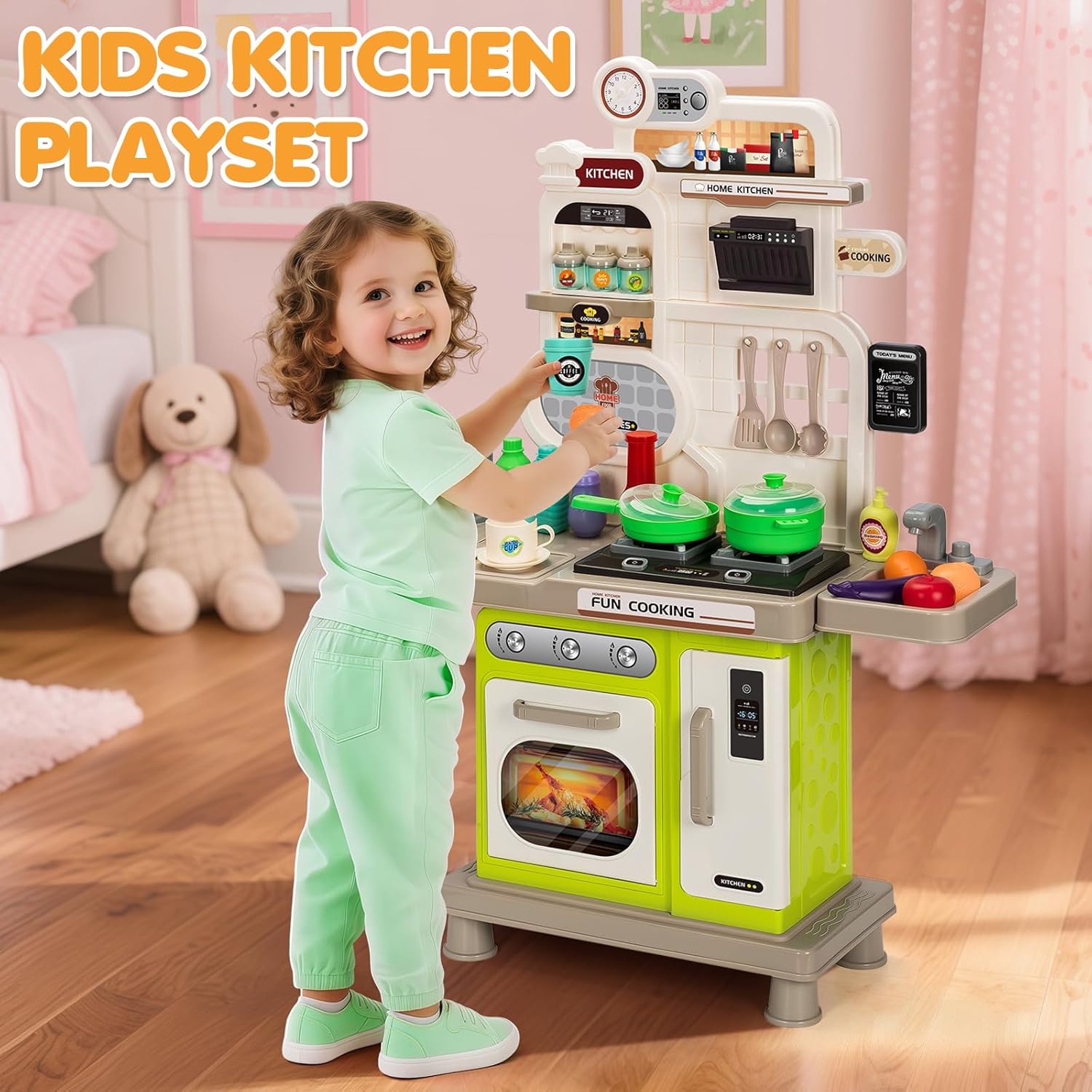 Kids Play Kitchen Playset, Pretend Cooking Stove, Recirculating Play Sink & Coffee Maker, Complete with Play Food & Accessories, Basic Cardboard Box Packaging – Not Ideal for Gifting – Green