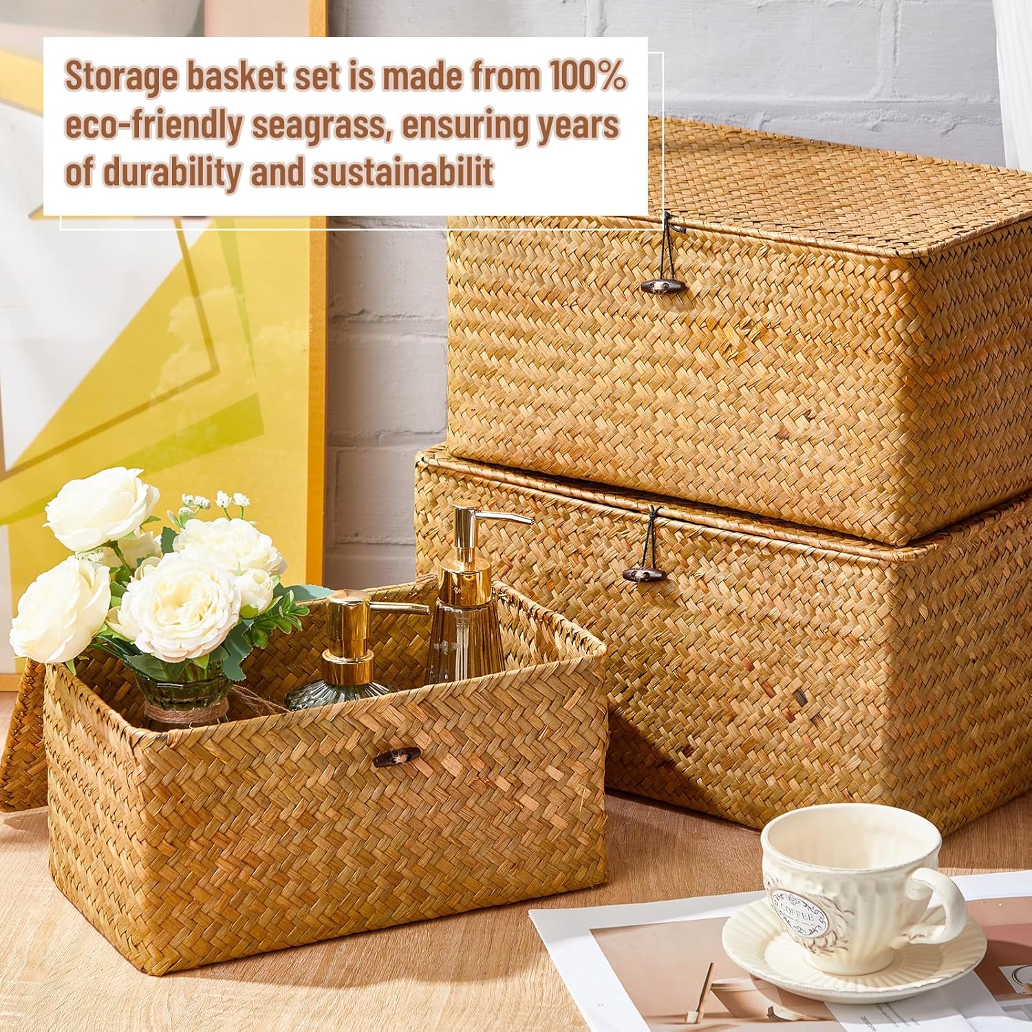 Features: You can give the seagrass storage basket box with lid as a gift for Christmas, Thanksgiving, and various parties. The rectangular woven shelf baskets bins are easy for you to match well with various styles of occasions. Also they can keep harmonious with house styles, which can bring refreshing feelings. Specifications: Material: seagrass Color: yellow brown Size: approx. 14.96 x 10.24 x 7.87 inches/ 38 x 26 x 20 cm, approx. 14.17 x 9.45 x 7.09 inches/ 36 x 24 x 18 cm, approx. 12.2 x 7.09 x 5.91 inches/ 31 x 18 x 15 cm, approx. 11.42 x 6.3 x 5.12 inches/ 29 x 16 x 13 cm, approx. 10.24 x 5.51 x 4.33 inches/ 26 x 14 x 11 cm and approx. 9.45 x 4.72 x 3.15 inches/ 24 x 12 x 8 cm Package includes: 6 x Wicker shelf baskets bins with lids Notes: Manual measurement, please allow slight errors on size. The color may exist a slight difference due to different screen displays.
