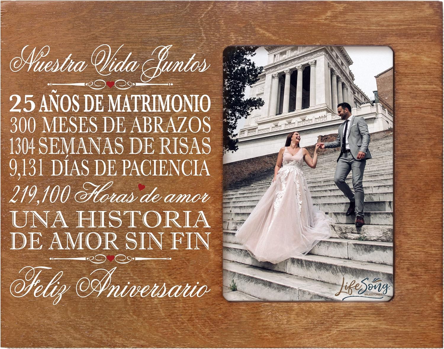Celebrate your special anniversary day with your lover by enjoying LifeSong Milestones Solid Wood Wedding Anniversary Picture Frame. Get this gift as a keepsake to remember your special day. LifeSong Milestones has created the perfect Wedding Anniversary photo frame gift with Spanish Verse. Wooden picture frames were designed, handcrafted, and engraved by 2020 LifeSong Milestones.