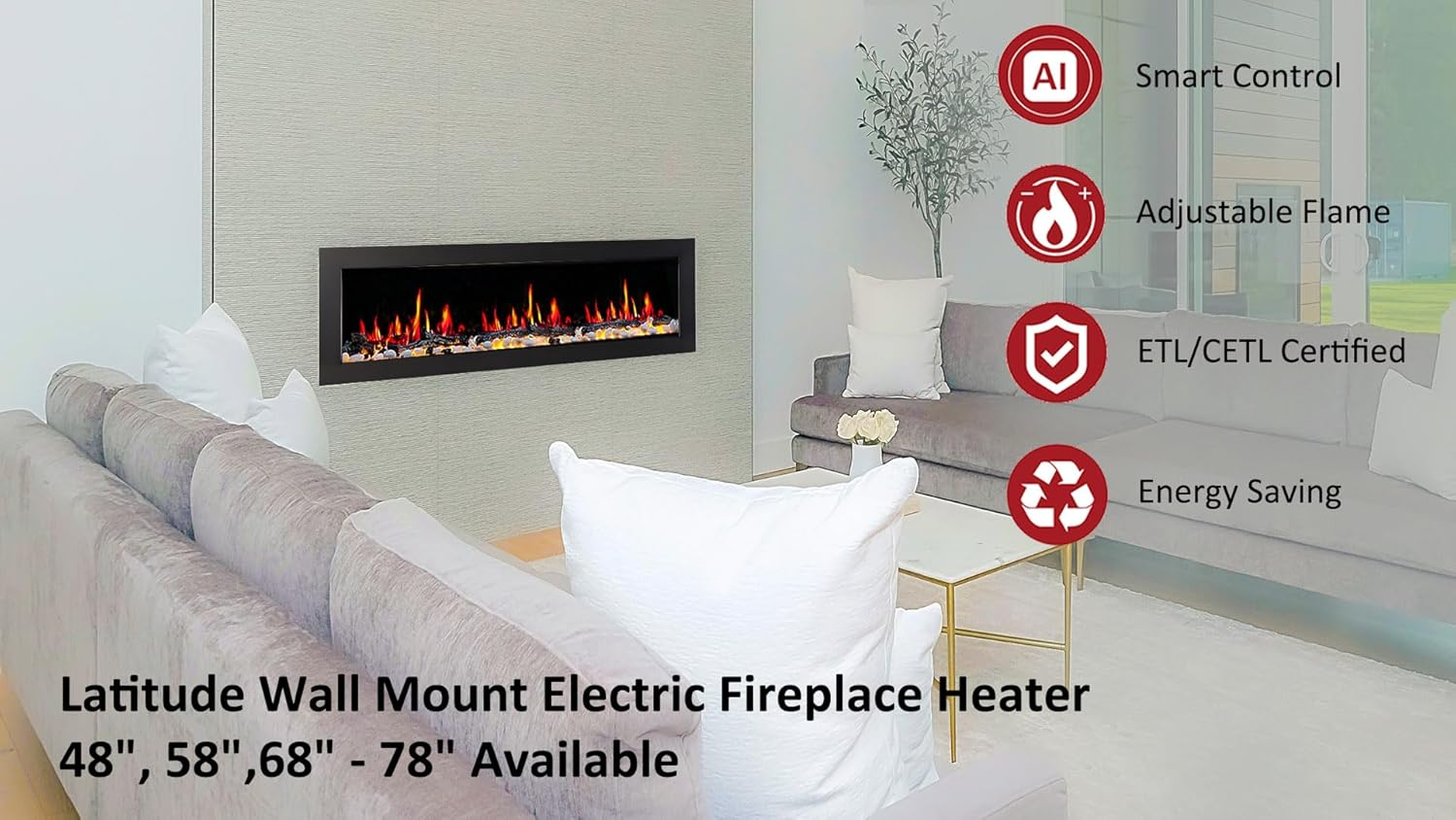 | Additional Features | Energy-Efficient Heating – Dual heat settings (750W & 1500W) deliver efficient warmth for rooms up to 400 sq ft., Patented GT-Xview & HD LED fireplace technology, 5 unique natural flame colour, Ultra-Slim Design – The compact 48-inch profile fits seamlessly into modern homes and décor styles., Wi-Fi Smart Fireplace App – Control your fireplace remotely via smartphone or tablet, adjusting settings, timers, and temperature. |
