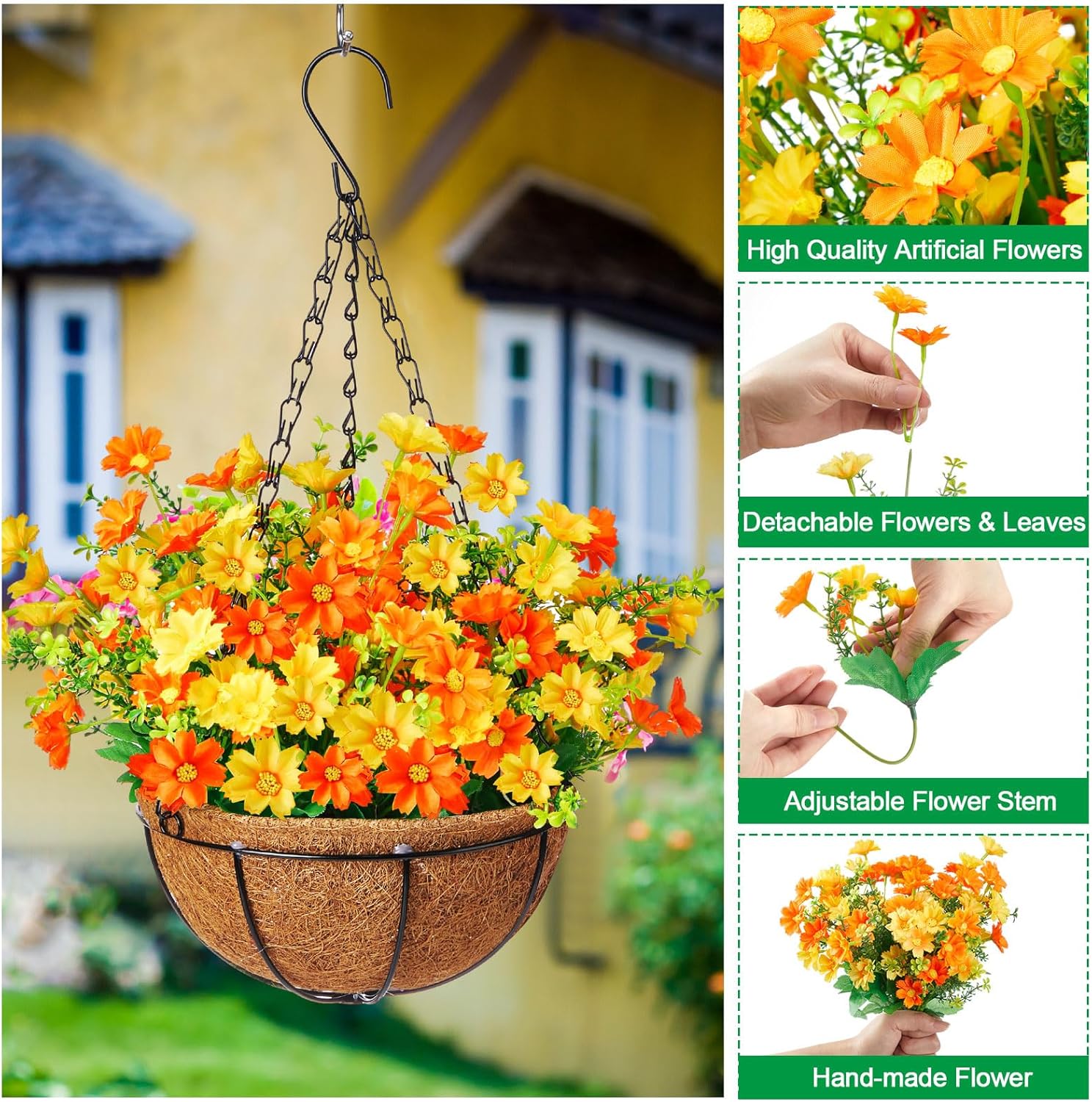 Features: Ideal for festive and unplanned decorations: Sporting artificial daisy flowers, these flower baskets are lifelike and can be applied to enhance the beauty of your garden, balcony, bedroom, kitchen, and more! They make a great gift for all occasions. Be it house warming, birthdays, anniversaries or any other holidays. Express your happiness by gifting our hanging faux plants outdoor to your friends, family or colleagues. Natural and classic appeal: The artificial hanging flower with coconut lining hanging baskets brings a rustic and elegant touch to your house decor. They seamlessly blend with both your indoor and outdoor settings. It is more than just a decorative piece, it's a style statement that adds a touch of nature to your living space. Elegance, durability and simplicity combine to make our artificial outdoor plant an ultimate choice. Specifications: Material: mainly metal, coconut lining, foam, silk and plasticColor: mainly yellow and brownSize: approx. 12 x 12 x 5.1 inch (L x W x H), about 13.7 inch long in chainPackage includes: 2 x Artificial hanging daisy flowers in coconut lining basketNotes: Manual measurement, please allow slight errors on size. The color may exist a slight difference due to different screen displays.