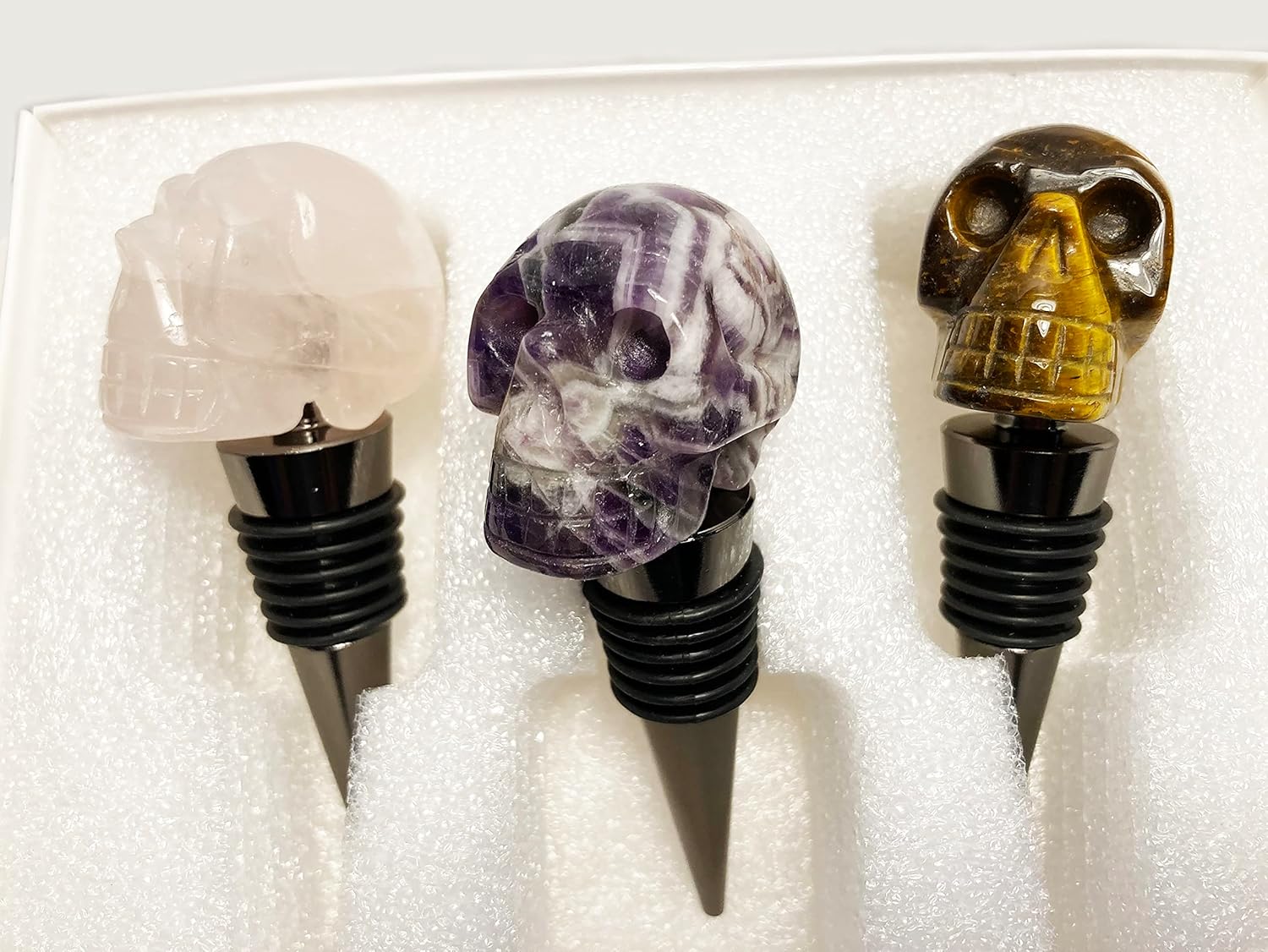 Gemstone quality Rose Quartz, Amethyst and Tiger Eye are hand-carved into a SKULL shape to top off this set of three beautiful and decorative wine bottle stoppers. The stoppers are made of rust-proof aluminum and features six silicon food grade rings to keep wine fresh. Rose Quartz, with its soft, gentle, almost pastel pale pink coloring is a good indication of its most commonly known property: that of pure love. It’s a stone of both giving and receiving love. Amethyst is often used during meditation to provide an overall sense of spiritual balance. Cross-culturally, this popular gemstone is used as a symbol of peace and unification. Tiger Eye is said to combine earth energy with light or sun energy, creating an intense stone that's also well-grounded. Enjoy your favorite wines and spirits in style when using Mazeology’s beautiful and unique handcarved Rose Quartz, Amethyst and Tiger Eye Skull wine stoppers. These Skull stoppers will add panache to any setting. Mazeology also offers additional Skull products including Wine Bottle Stoppers featuring other Gemstones Handcarved into Skulls, and Mouth-blown Borosilicate Glass Sculpted Skull Glasses in three sizes, as well as Skull Shaped Wine Glasses, and also a matching Skull Decanter with an air-tight faceted stopper. Look for these in additional Amazon Mazeology listings. MAZEOLOGY features premium design-forward home goods & gifts for everyday occasions and holiday celebrations including Greeting and Maze Cards, Illustrated Mousepads, Unique Glassware, Porcelain & Bone China Dishware, Tote Bags & Small Leather Goods and the Multiple National Award-Winning Family Card Game WORD SPLICE - all products with unique original designs and fine quality fabrications. The Handcarved, Sculpted Rose Quartz, Amethyst and Tiger Eye SKULL Shaped Wine Bottle Stoppers are part of the 2023 Mazeology Skull home goods collection. NOT AVAILABLE IN ANY STORE. To see the entire collection, just type in MAZEOLOGY in the search bar.