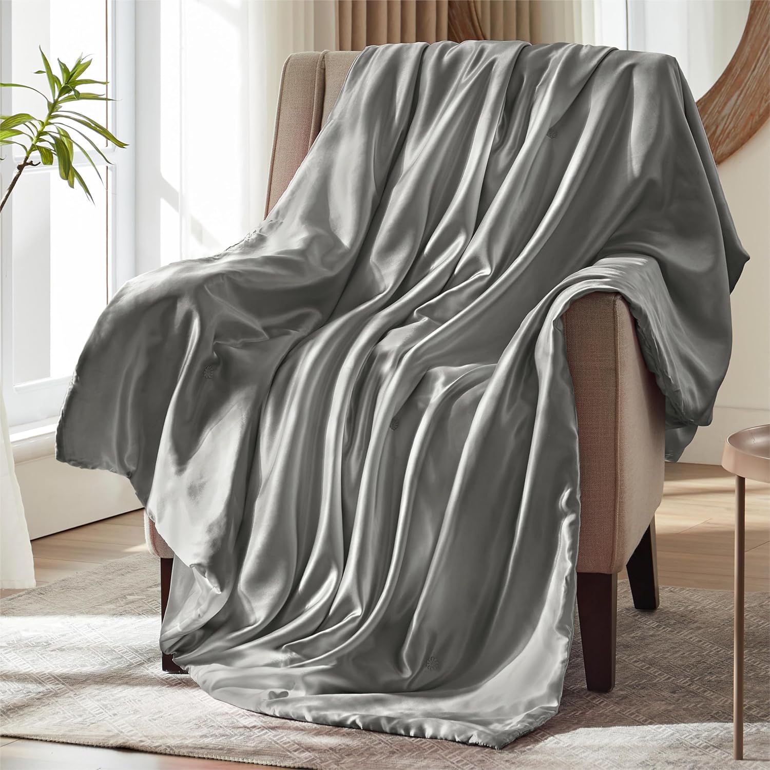 About MILVOWOC Satin Throw Blanket - As smooth as silk, you will be amazed at how soft and smooth the texture feels. - Surface is featured with small flower, while helping to locate the core also add some elegant feeling. - Satin fabric helps maintain the moisture balance of your skin, reducing friction and potential irritation. - Easy to carry, no matter where you are, keep you cool in summer and warm in winter. Specifications: Material: Stain (100% Polyester) Available Size: 60"L x 50"W, 60"L x 80"W, 90"L x 90"W; Multi-Colors: Light Grey,Blush Pink,Rust Orange,Beige,Forest Green,Silver Grey,Sage Green Notices: 1.The color of the item may slightly differ from the pictures due to variations in photography lighting. 2.Please avoid placing sharp objects such as earrings, rings, or hangnails on the blankets to prevent snagging the fabric.