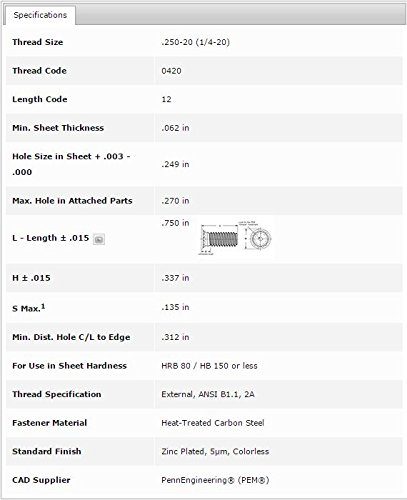 SPECIFICATION ManufacturerPenn Engineering Manufacturer's Part NumberFH-0420-12ZI DescriptionFH-0420-12ZI Flush-Head Threaded Stud Product TypeFH Thread Size1/4-20 Length0.75 in Material SpecificationHeat-Treated Carbon Steel Finish SpecificationZinc plated per ASTM B633, SC1 (5µm), Type III, Colorless Sheet Thickness0.062 in