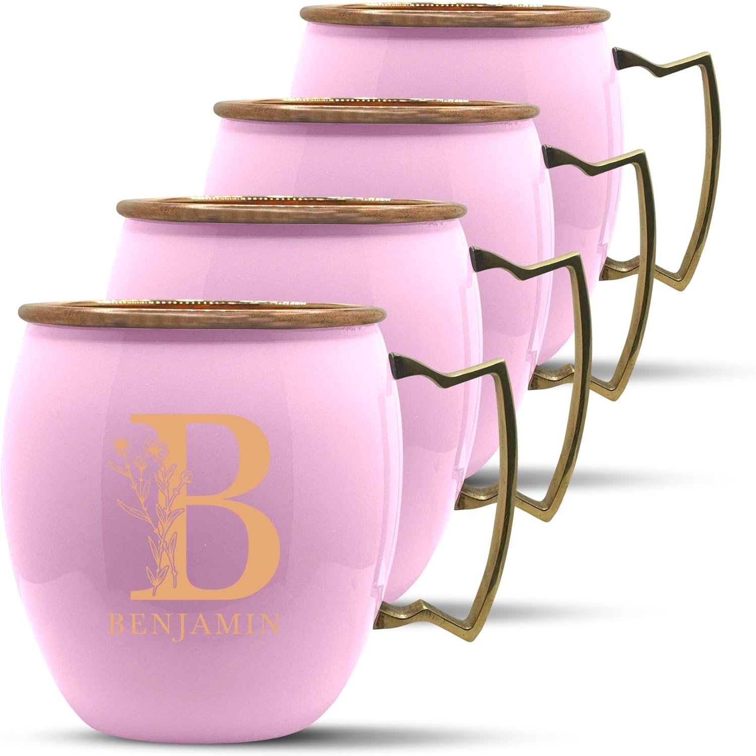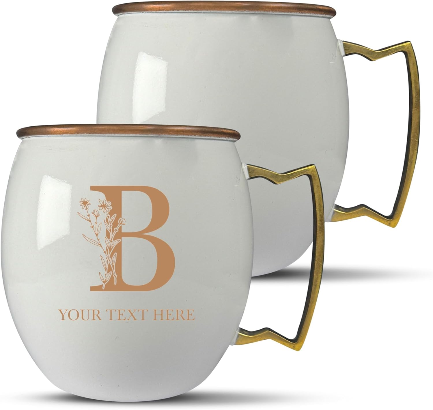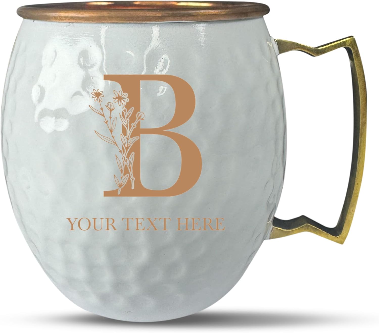 Crafted with precision and timeless elegance, our Personalized Custom Copper Mug is the epitome of sophistication for your favorite cold beverages and cocktails. Embrace the artistry of the Moscow Mule experience with this 18 oz masterpiece. Designed for those who appreciate the finer things in life, this copper mug boasts a seamless rolled rim that adds a touch of refinement to each sip. The brass handle not only complements the pure copper construction but also provides a comfortable grip, ensuring every moment of indulgence is a pleasure. The hammered finish of the mug not only enhances its aesthetic appeal but also reflects the commitment to quality in its craftsmanship. Elevate your drinking experience with the cool touch of pure copper against your fingertips. This mule is designed for cold liquids only. Do not use with hot liquids. Make it yours by opting for our personalized engraving service. The black cup becomes a canvas for your custom letter name engraving, creating a bar-style aesthetic that is truly one-of-a-kind. Add a personal touch to your collection or surprise a loved one with a thoughtful and stylish gift. Please note that this exquisite copper mug requires gentle care to maintain its pristine appearance. Handwash only and dry quickly to preserve its the copper interior, the exterior hammered painted finish and intricate details. Let this personalized copper mug be the centerpiece of your gatherings, making every sip a moment to savor. Elevate your drinking experience with a touch of personalized luxury that transcends ordinary barware.
