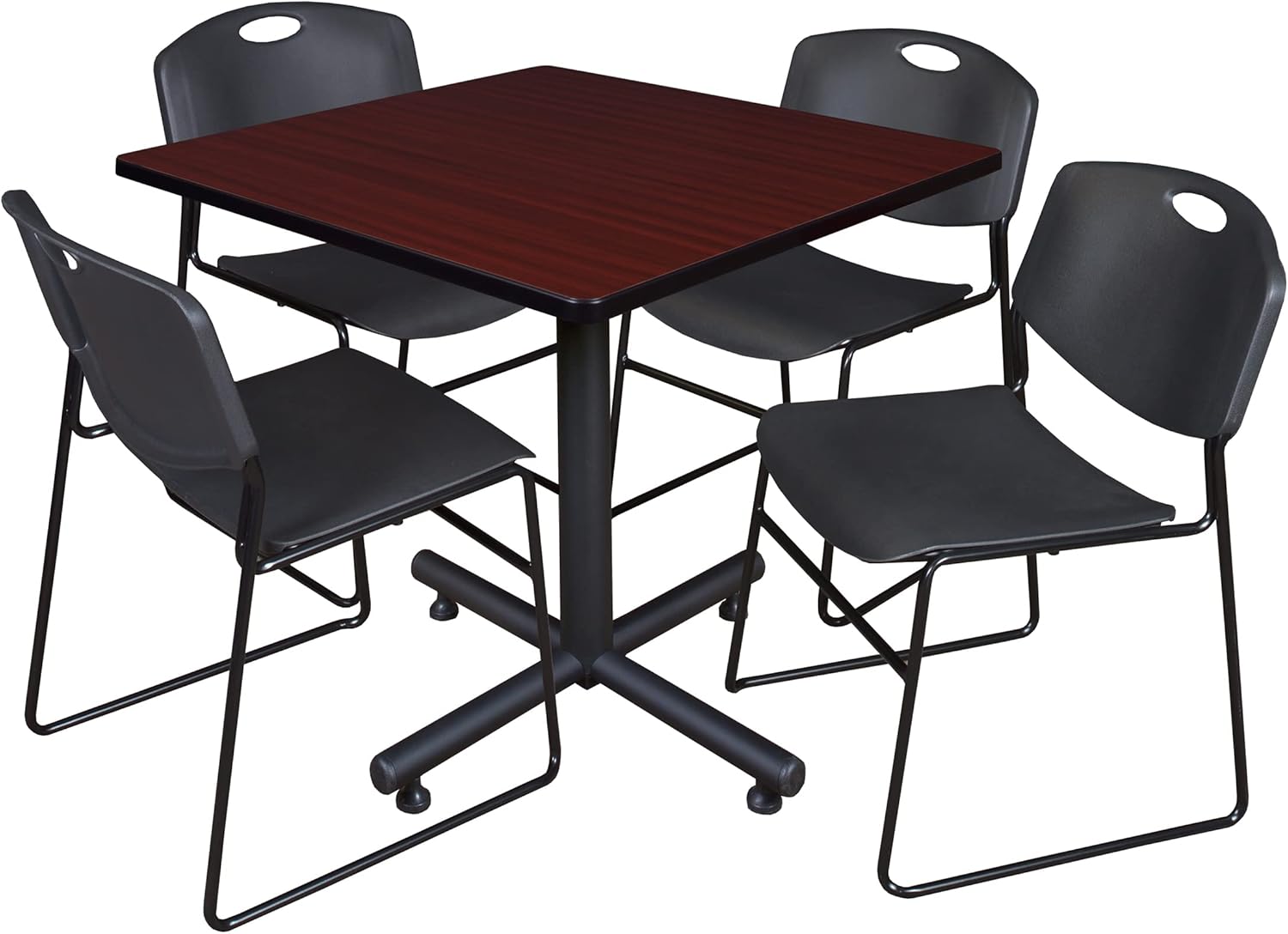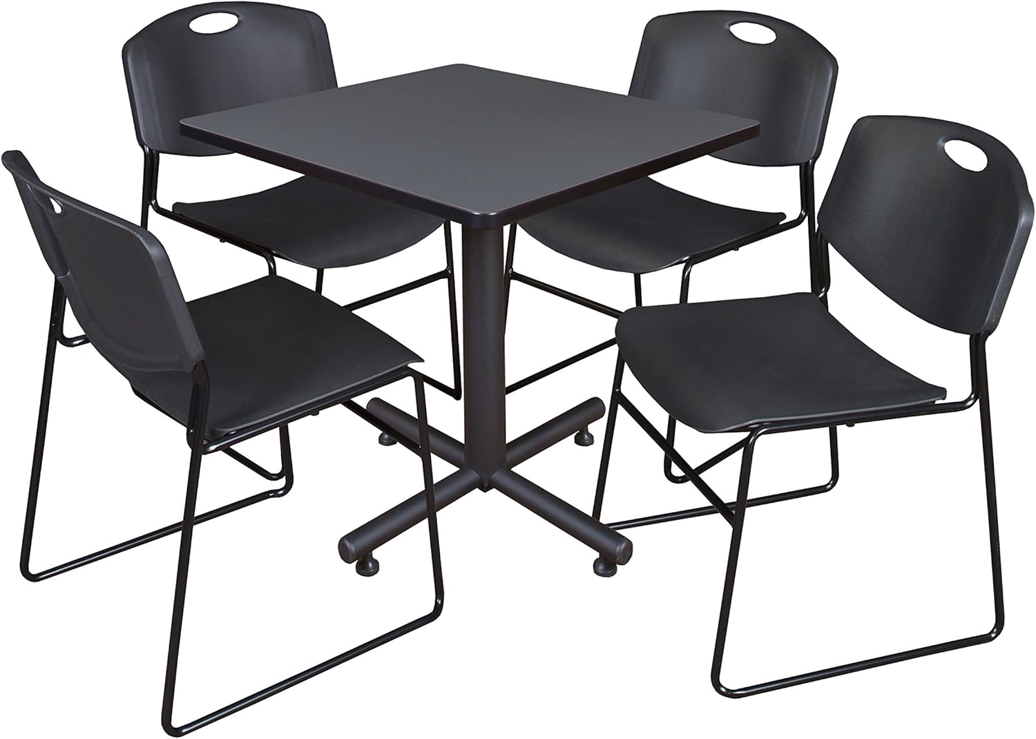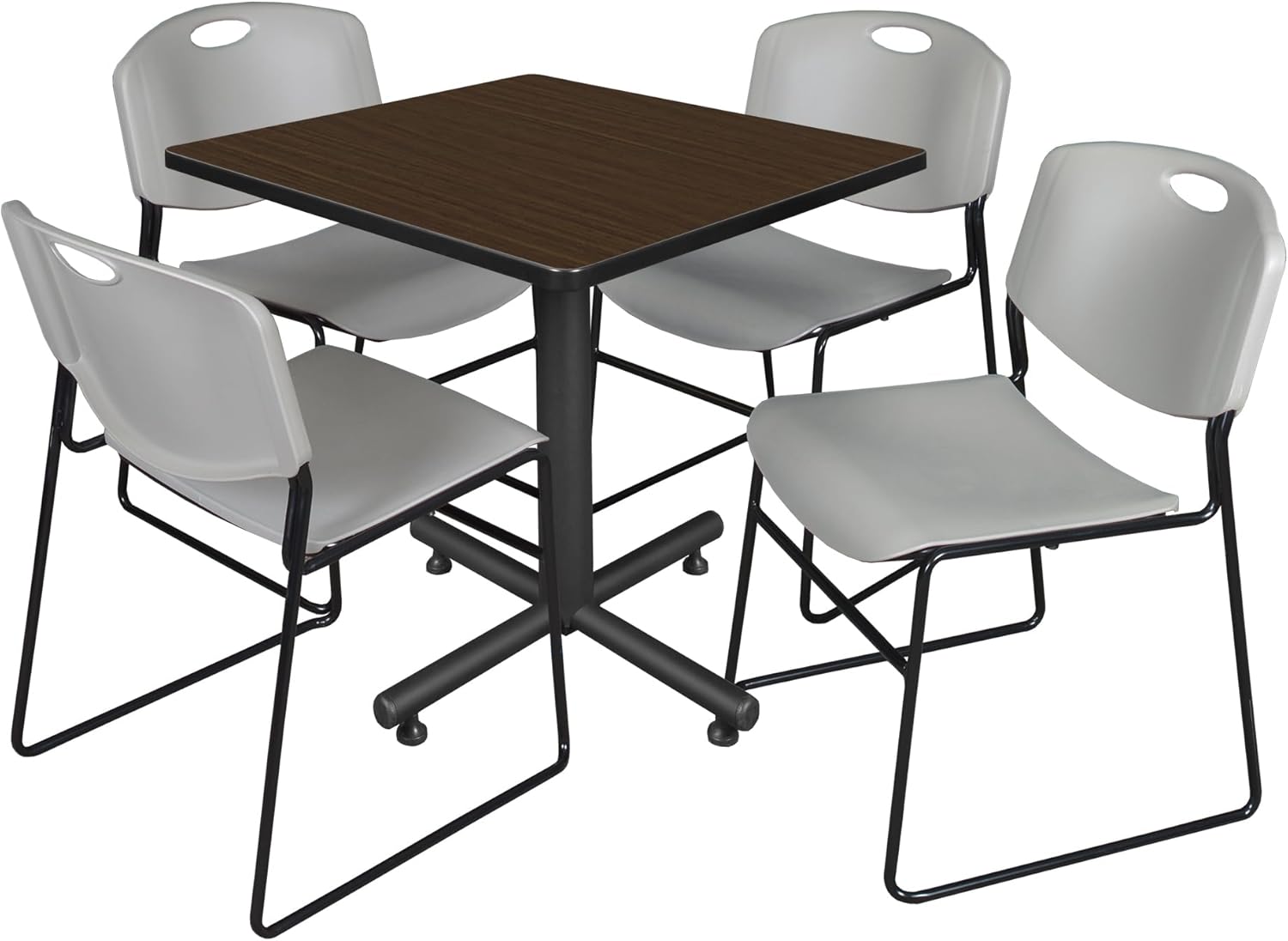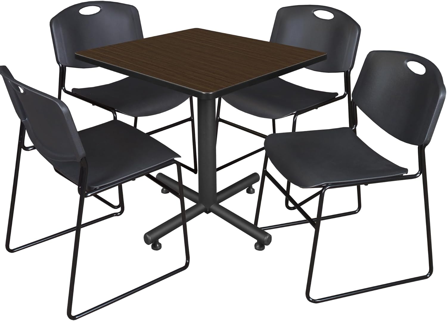 The elegant Kobe collection puts the class in classroom. These versatile tables are at home in stylish restaurant settings as well as classrooms, breakrooms and more. This set includes one 30-inch square Kobe table and four Black Zeng Stack Chairs. The table is constructed of a thermal fused melamine laminate tabletop that is 1-inch thick and finished with a black Bumper Edge edge band. This Noble Oak tabletop is double-sided and finished in Neo Walnut on the other side. Rounded corners make the table safer for everyone. Simply pick the side you like and install the base on the other. Self tapping wood screws and a placement template are included. Laminates are scratch, stain and scald resistant and wipe clean easily. The base is constructed of a black tubular steel X-Base and is protected with a black powder coated finish for a uniform, matte finish. Adjustable glides on the bottom that raise the whole base off the ground give the Kobe collection an open, modern look. Regency's Patent-Pending Zeng stack chair is not only unique, but durable, sturdy and versatile as well. The Zeng seat and back are treated with an anti-microbial agent, which makes it perfect for schools, waiting rooms, cafeterias and more. A reinforced black metal frame is designed to support up to 400lbs and a built in handle makes moving the chair easier. All Regency chairs are backed by a 5-year limited manufacturer's warranty on chair bases and frames and a 2-year limited manufacturer's warranty on chair mechanisms and upholstery. Kobe table bases are backed by a 10-Year Limited Manufacturer's Warranty.