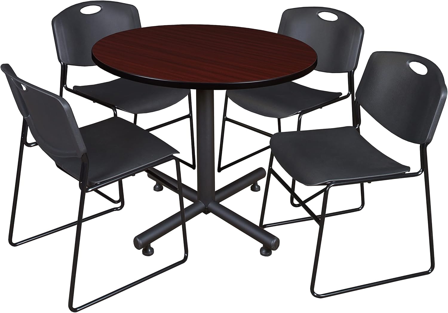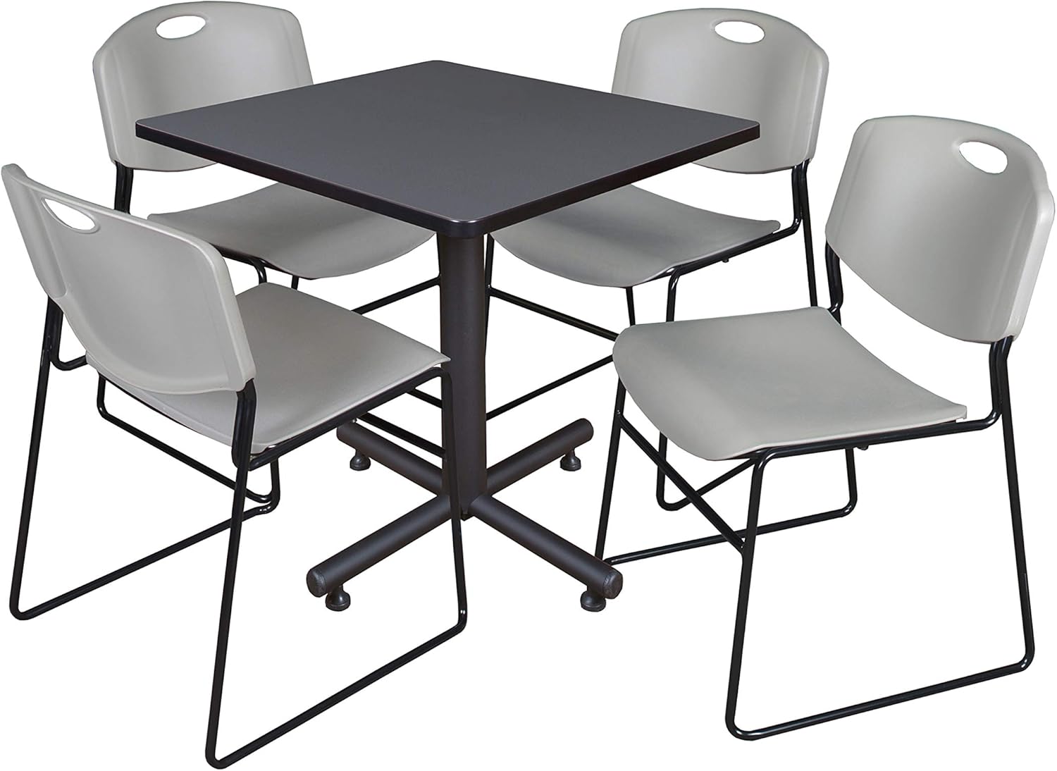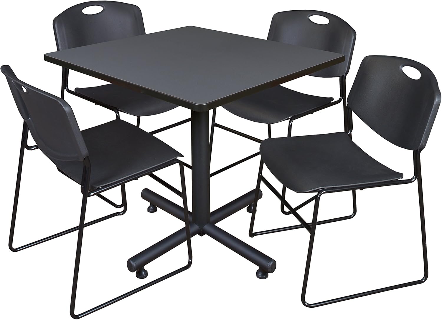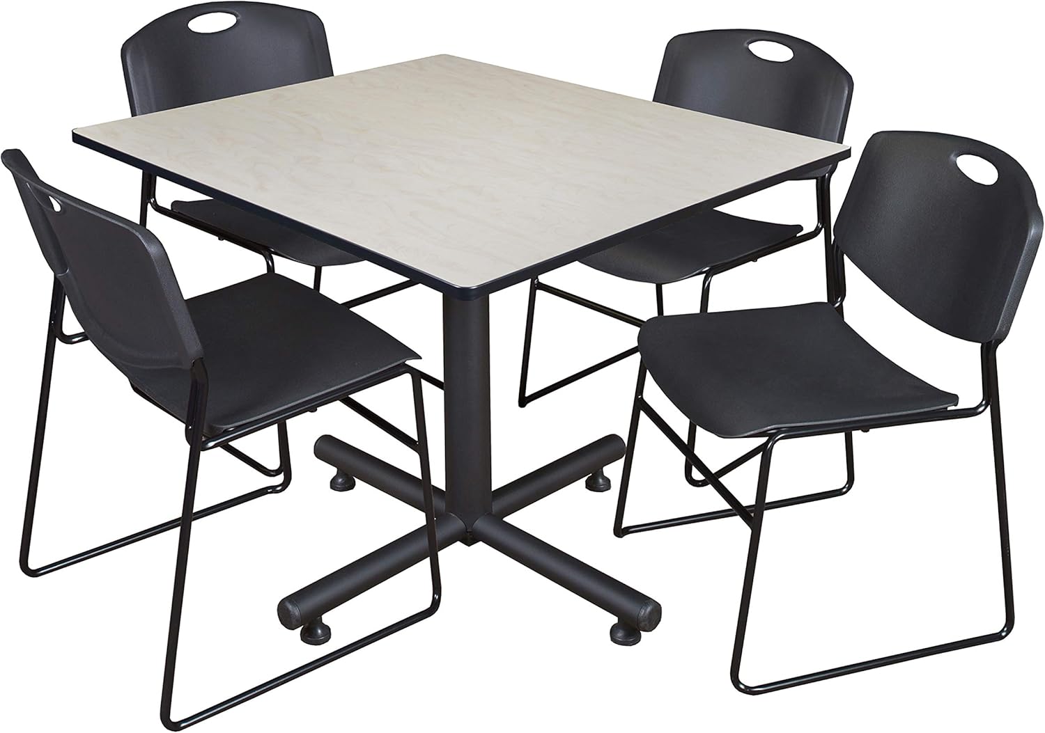 The elegant Kobe collection puts the class in classroom. These versatile tables are at home in stylish restaurant settings as well as classrooms, breakrooms and more. This set includes one 30-inch square Kobe table and four Black Zeng Stack Chairs. The table is constructed of a thermal fused melamine laminate tabletop that is 1-inch thick and finished with a black Bumper Edge edge band. This Noble Oak tabletop is double-sided and finished in Neo Walnut on the other side. Rounded corners make the table safer for everyone. Simply pick the side you like and install the base on the other. Self tapping wood screws and a placement template are included. Laminates are scratch, stain and scald resistant and wipe clean easily. The base is constructed of a black tubular steel X-Base and is protected with a black powder coated finish for a uniform, matte finish. Adjustable glides on the bottom that raise the whole base off the ground give the Kobe collection an open, modern look. Regency's Patent-Pending Zeng stack chair is not only unique, but durable, sturdy and versatile as well. The Zeng seat and back are treated with an anti-microbial agent, which makes it perfect for schools, waiting rooms, cafeterias and more. A reinforced black metal frame is designed to support up to 400lbs and a built in handle makes moving the chair easier. All Regency chairs are backed by a 5-year limited manufacturer's warranty on chair bases and frames and a 2-year limited manufacturer's warranty on chair mechanisms and upholstery. Kobe table bases are backed by a 10-Year Limited Manufacturer's Warranty.