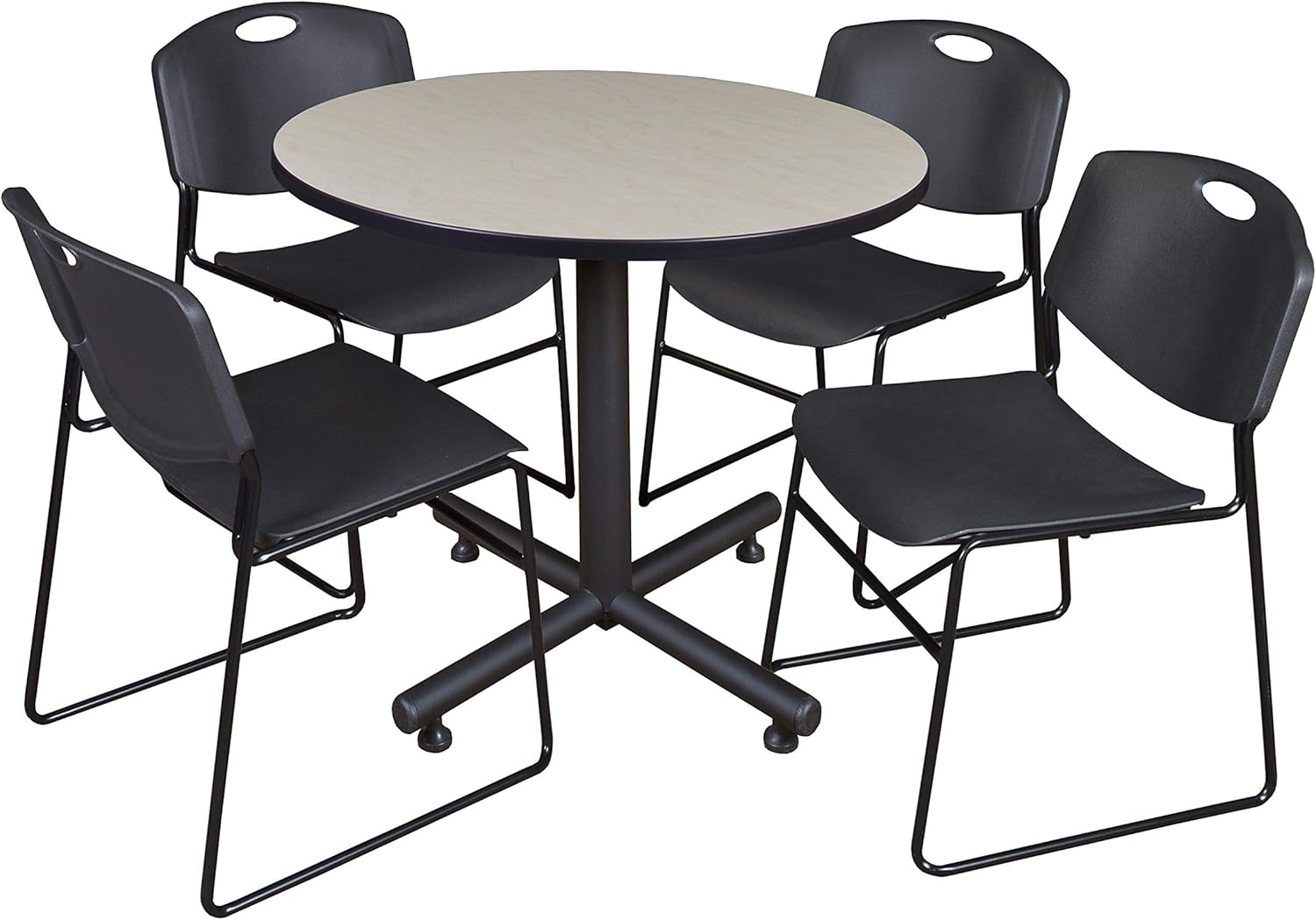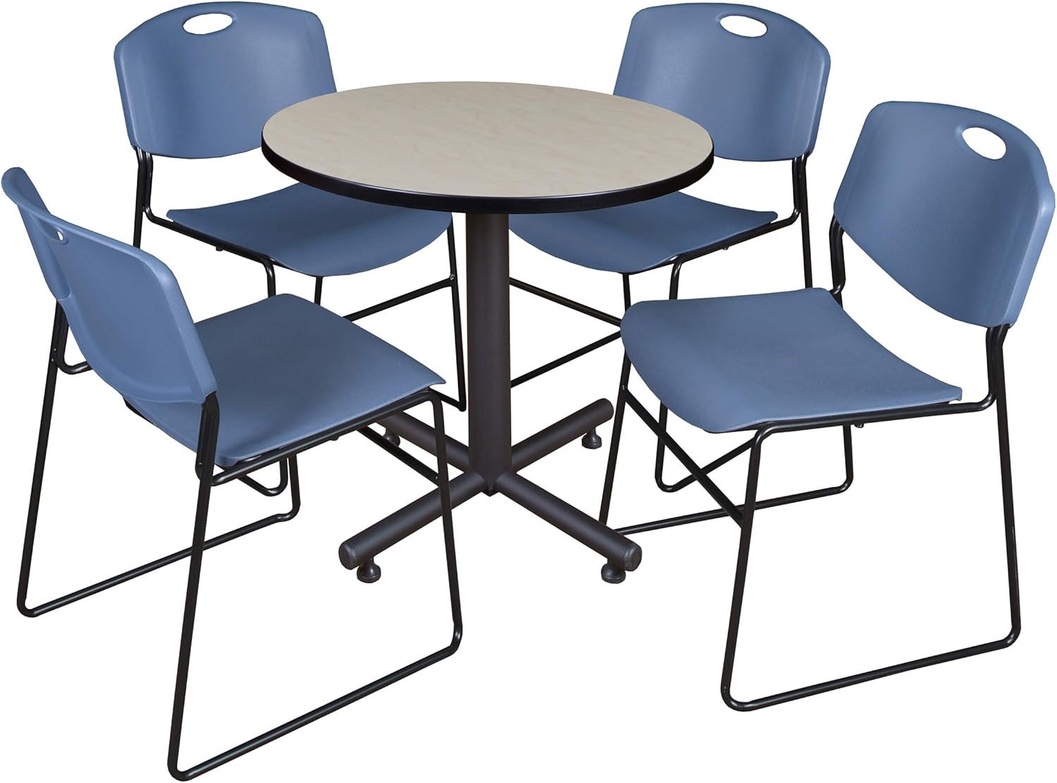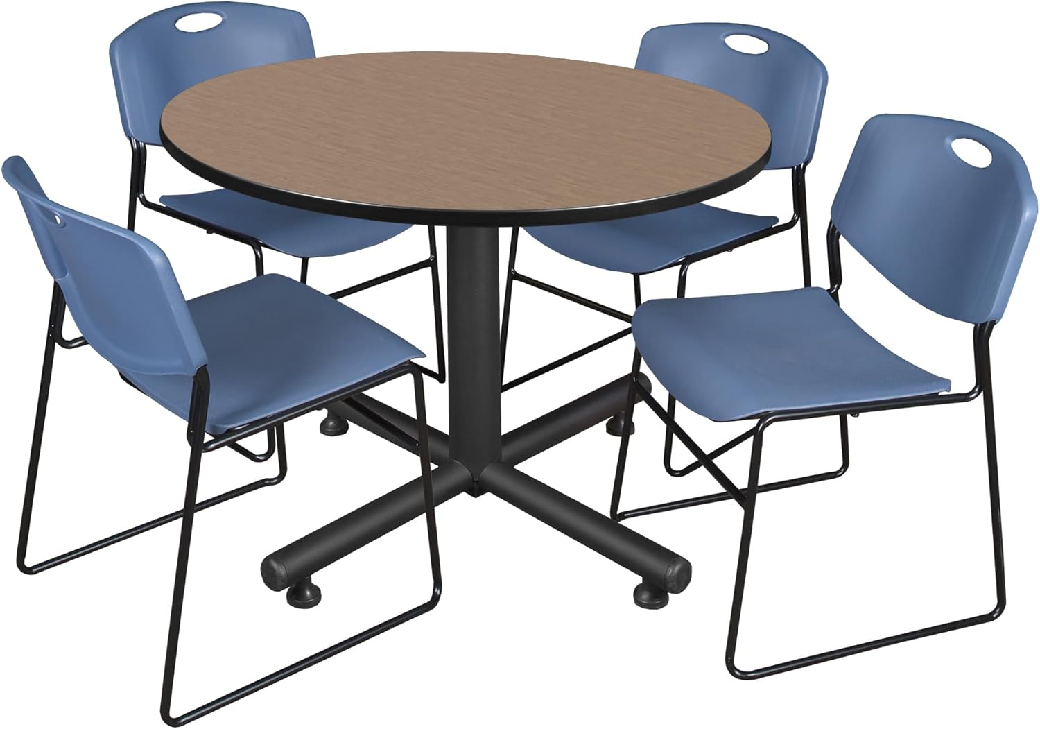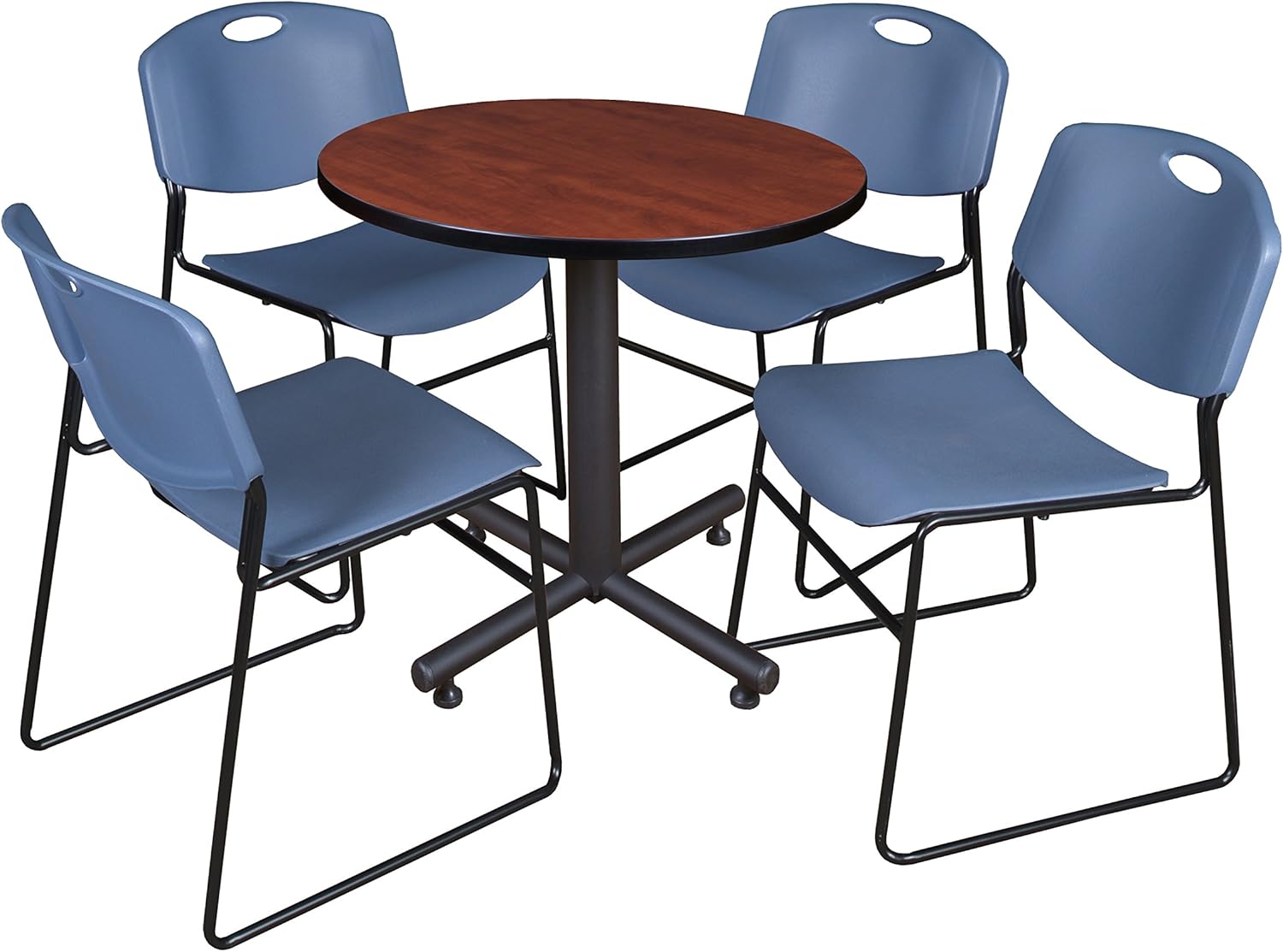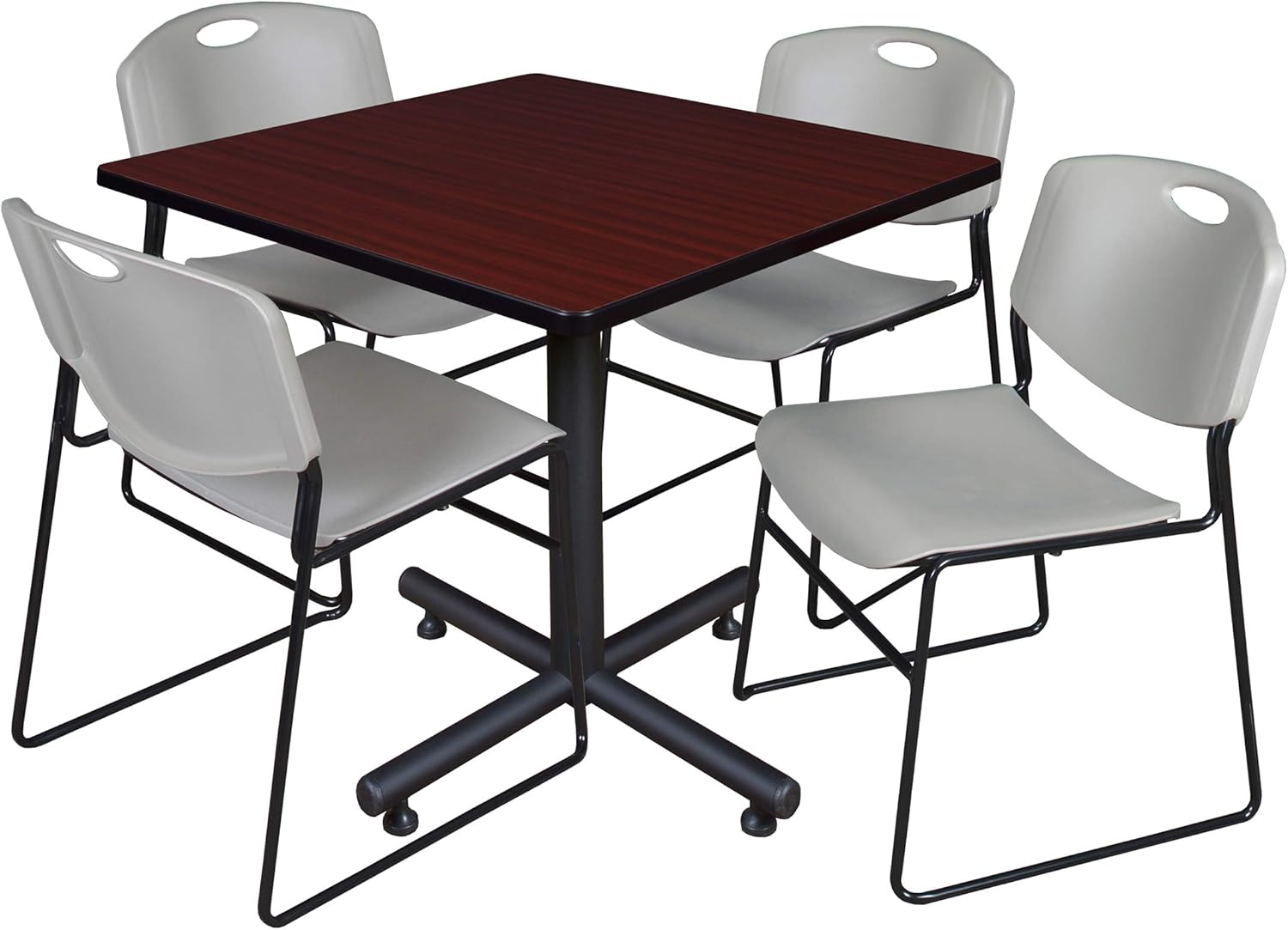 The elegant Kobe collection puts the class in classroom. These versatile tables are at home in stylish restaurant settings as well as classrooms, breakrooms and more. This set includes one 30-inch square Kobe table and four Black Zeng Stack Chairs. The table is constructed of a thermal fused melamine laminate tabletop that is 1-inch thick and finished with a black Bumper Edge edge band. This Noble Oak tabletop is double-sided and finished in Neo Walnut on the other side. Rounded corners make the table safer for everyone. Simply pick the side you like and install the base on the other. Self tapping wood screws and a placement template are included. Laminates are scratch, stain and scald resistant and wipe clean easily. The base is constructed of a black tubular steel X-Base and is protected with a black powder coated finish for a uniform, matte finish. Adjustable glides on the bottom that raise the whole base off the ground give the Kobe collection an open, modern look. Regency's Patent-Pending Zeng stack chair is not only unique, but durable, sturdy and versatile as well. The Zeng seat and back are treated with an anti-microbial agent, which makes it perfect for schools, waiting rooms, cafeterias and more. A reinforced black metal frame is designed to support up to 400lbs and a built in handle makes moving the chair easier. All Regency chairs are backed by a 5-year limited manufacturer's warranty on chair bases and frames and a 2-year limited manufacturer's warranty on chair mechanisms and upholstery. Kobe table bases are backed by a 10-Year Limited Manufacturer's Warranty.