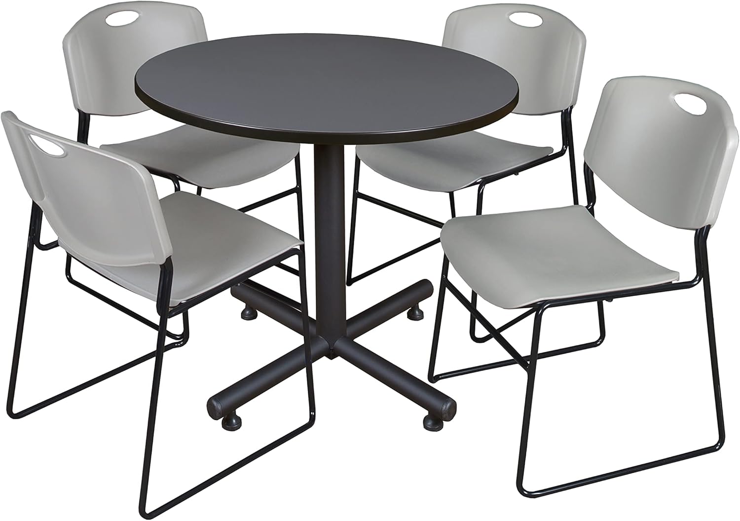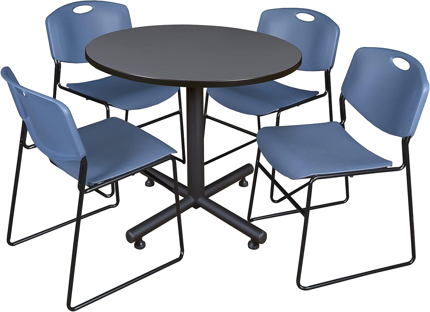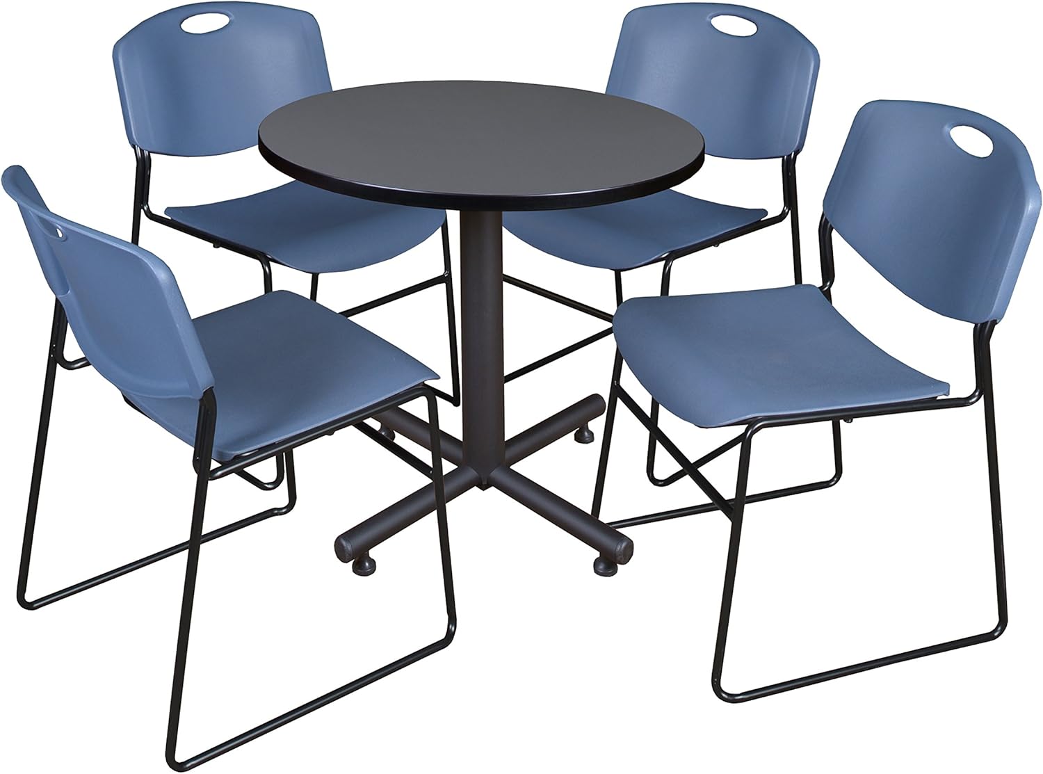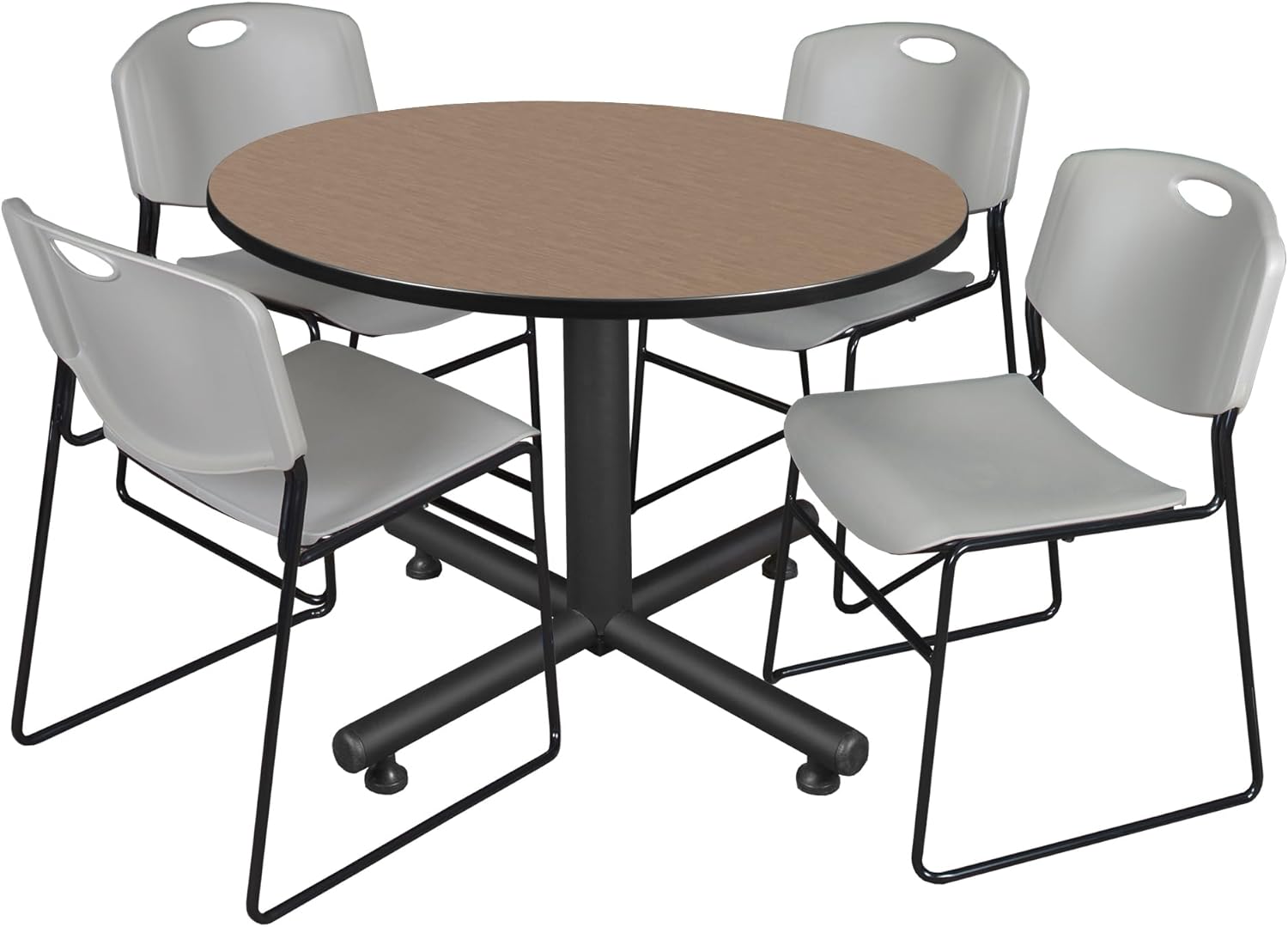 The elegant Kobe collection puts the class in classroom. These versatile tables are at home in stylish restaurant settings as well as classrooms, breakrooms and more. This set includes one 30-inch square Kobe table and four Black Zeng Stack Chairs. The table is constructed of a thermal fused melamine laminate tabletop that is 1-inch thick and finished with a black Bumper Edge edge band. This Noble Oak tabletop is double-sided and finished in Neo Walnut on the other side. Rounded corners make the table safer for everyone. Simply pick the side you like and install the base on the other. Self tapping wood screws and a placement template are included. Laminates are scratch, stain and scald resistant and wipe clean easily. The base is constructed of a black tubular steel X-Base and is protected with a black powder coated finish for a uniform, matte finish. Adjustable glides on the bottom that raise the whole base off the ground give the Kobe collection an open, modern look. Regency's Patent-Pending Zeng stack chair is not only unique, but durable, sturdy and versatile as well. The Zeng seat and back are treated with an anti-microbial agent, which makes it perfect for schools, waiting rooms, cafeterias and more. A reinforced black metal frame is designed to support up to 400lbs and a built in handle makes moving the chair easier. All Regency chairs are backed by a 5-year limited manufacturer's warranty on chair bases and frames and a 2-year limited manufacturer's warranty on chair mechanisms and upholstery. Kobe table bases are backed by a 10-Year Limited Manufacturer's Warranty.
