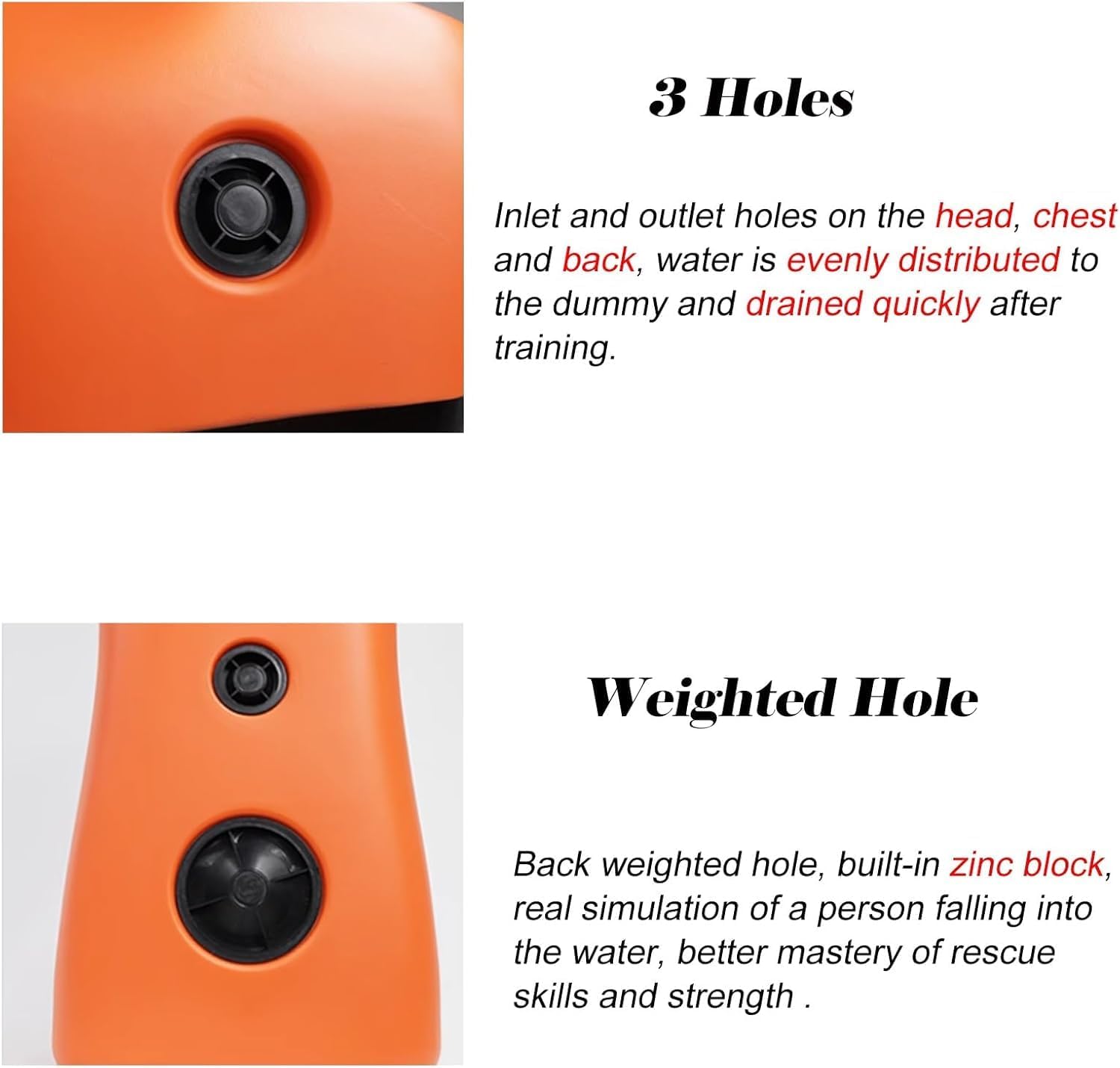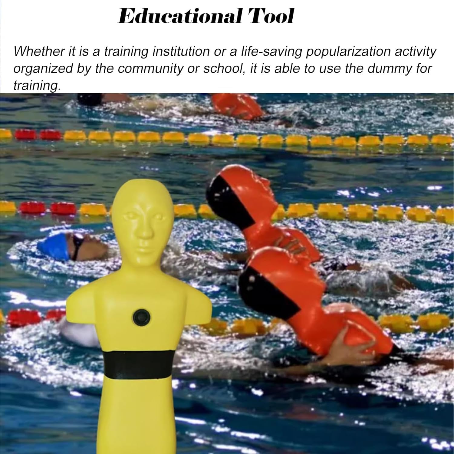 Specification :Name: Water Life-saving Training DummyColor: Orange, YellowMaterial: PEWeight: 8 kg/17.6 lbsFilled with Water Weight: 50 kg/110.2 lbsProduct Size:100x49x20 cm/39.4x19.3x7.9 inUsed for swimming pool lifeguard, professional lifeguard training dummy, water lifeguard simulator1. PE material, can be used repeatedly, not easy to be damaged or deformed2. Can be used in a variety of environments, including wet water environments and training areas that require regular sanitization3. During training, the dummy can easily float on the water surface, simulating the state of a real drowning victim, helping the trainer to better master the water rescue skills4. Water can be injected through the water filling port to provide a highly effective training experience and help improve lifesaving skills5. Weighted design allows trainers to feel the resistance and difficulty of real rescue during the training process6. Can be used for regular swimming training and sea life-saving training7. The water rescue dummy can be used to carry out drowning prevention education, simulate various rescue scenarios, and improve safety awareness and self-rescue abilityPackage Includes :1 x Water Life-saving Training DummyTips :1. Manual measurement,there will be 1-3 cm error,please understand2. Due to light and personal differences in color understanding,there will be small color difference,in kind prevail