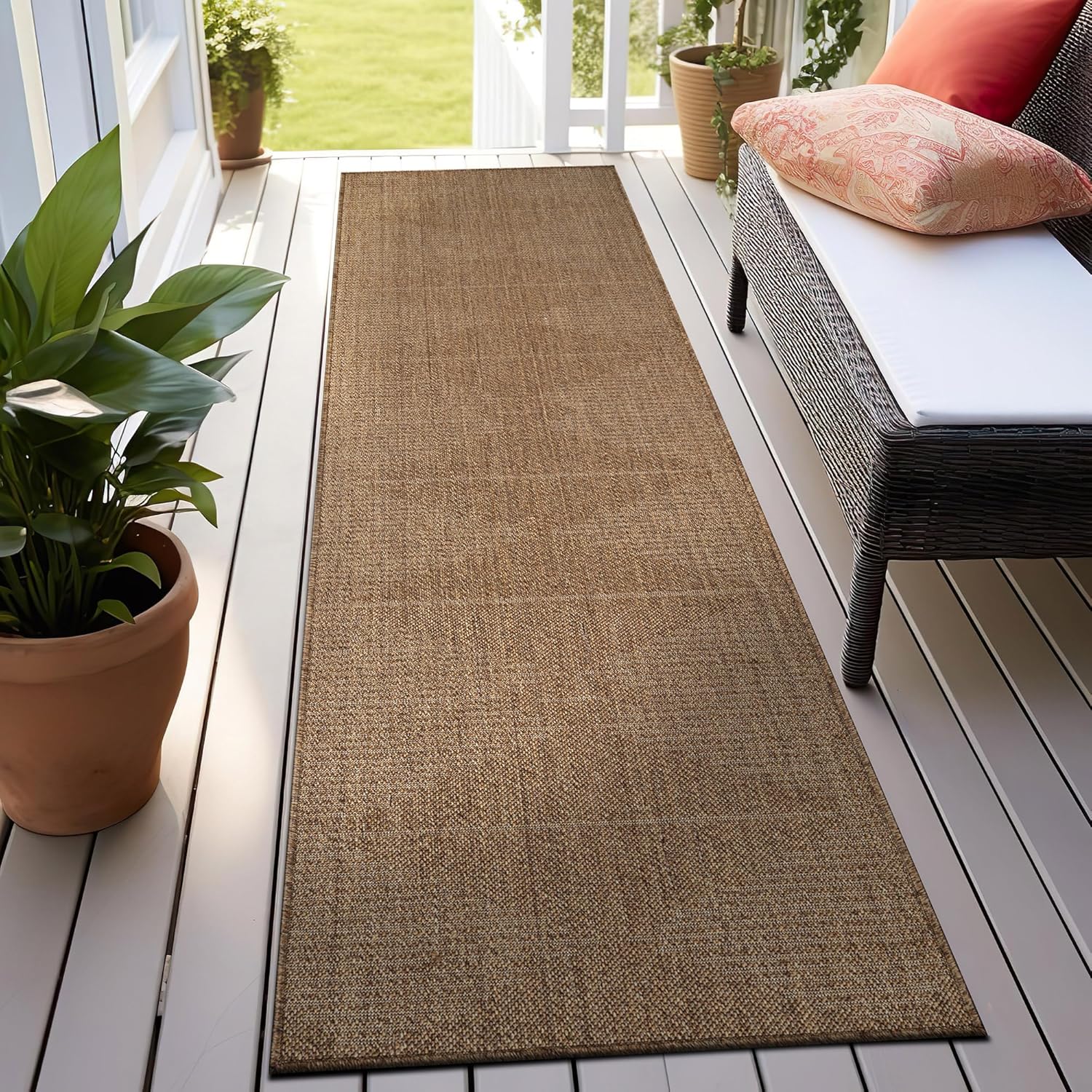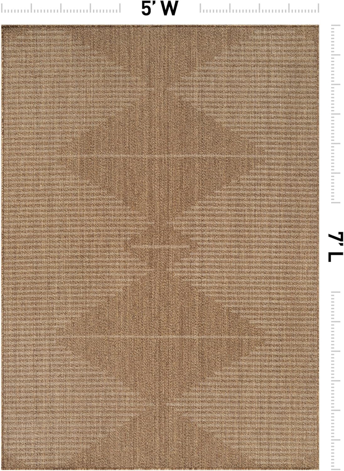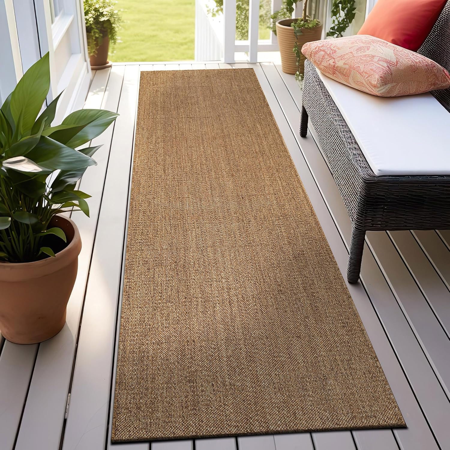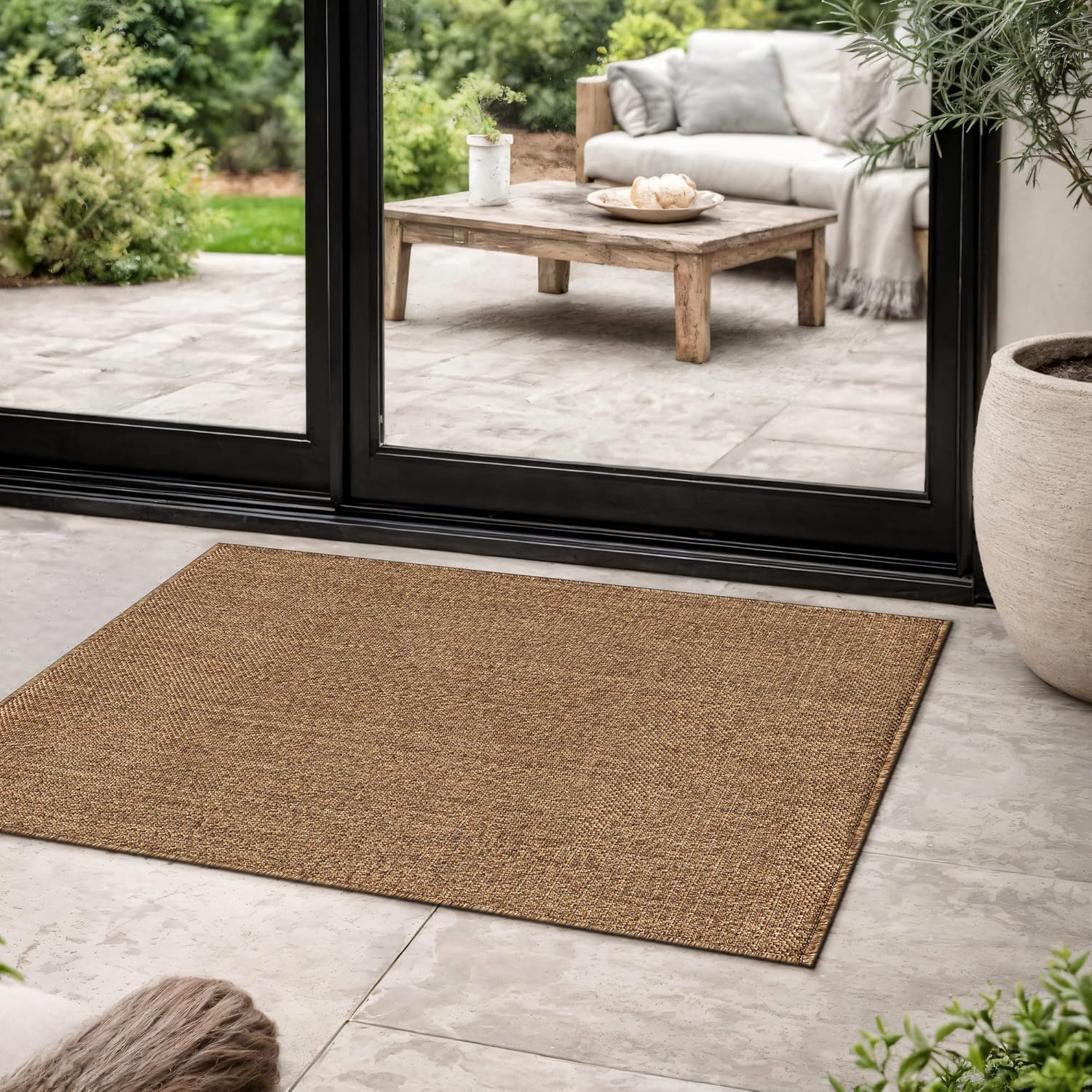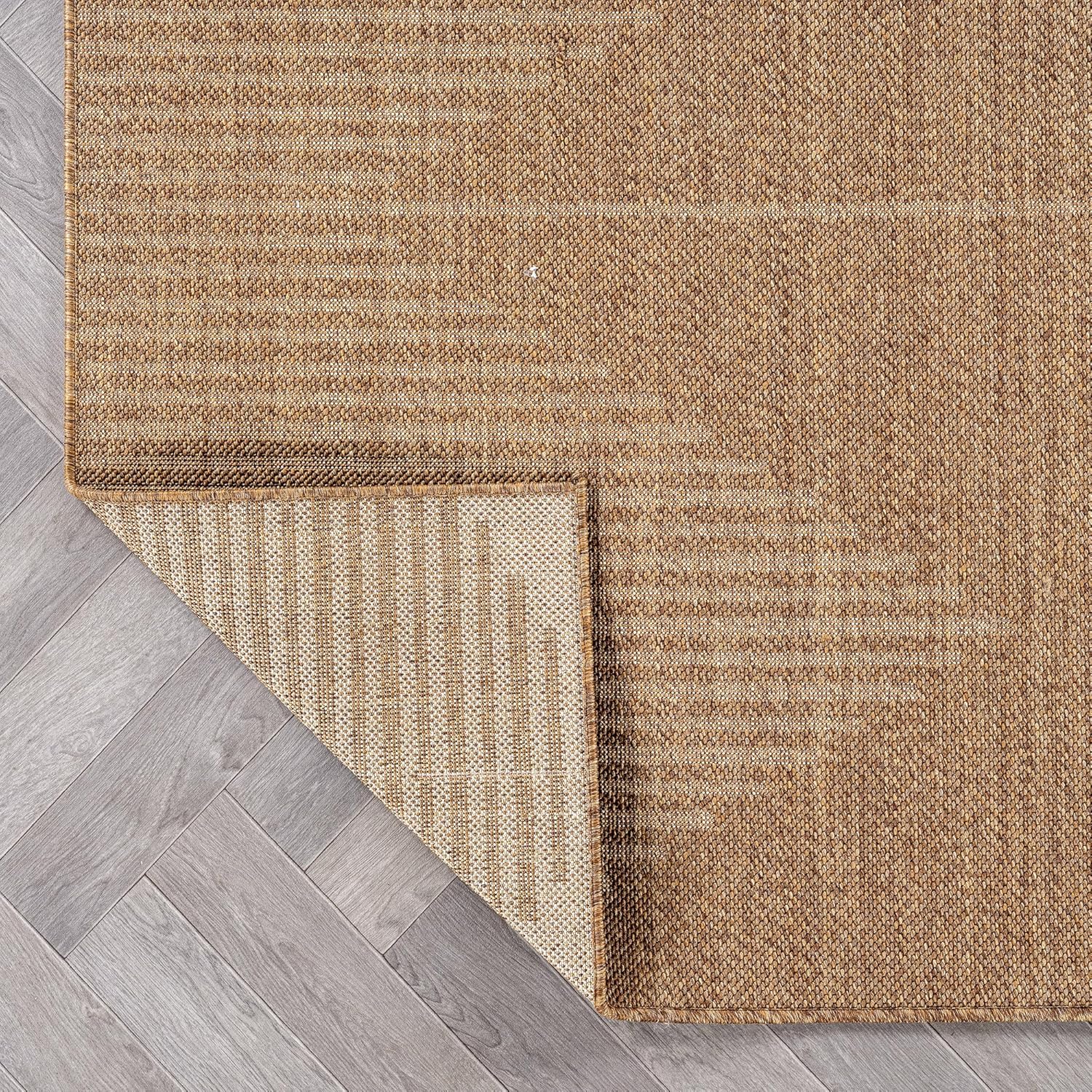 This indoor outdoor rug features a flatweave construction designed to deliver the look of natural fibers with easy everyday care. With its natural jute look outdoor rug appearance, it adds texture and warmth to patios, porches, decks, balconies, entryways, kitchens, and living rooms. The low-profile area rug design lays smoothly in high-traffic spaces and fits easily under furniture and near doorways. Machine made from durable 100% polypropylene fibers with a synthetic backing, this polypropylene area rug is designed for consistent indoor and outdoor use. The flatweave patio rug construction provides a structured surface suitable for covered outdoor areas and busy indoor living spaces. Maintenance is simple and convenient. Shake out debris, sweep, vacuum, or rinse with a garden hose to help maintain the appearance of your outdoor patio rug. After rinsing, hang over a railing and allow the rug to air dry completely before placing it back in use. The non-shedding construction makes this indoor outdoor area rug suitable for homes with kids and pets. For indoor placement on hard floors or other smooth surfaces, a rug pad is recommended to help keep the rug in place. Please note that color may vary slightly due to monitor settings, and slight variations in pattern or size may occur depending on the selected shape and dimensions.