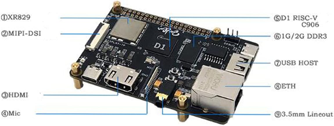 -Specification-Soc: Allwinner D1 single-core Xuantie c906 64-bit RISC-V processor@1.0 GHz with HiFi4 DSP,G2D 2D graphics accelerators.Memory:2GB DDR3 memoryStorage: 256MB SPI NAND flash ,MicroSD card slot. VideoDecoding:H.265 up to 1080p60 or 4Kp30,H.264 up to1080p60 or 4Kp24, MPEG-1/2/4, jpeg, VC1 up to 1080p60Audio: 35mm audio jack, digital audio output via HDMl , a connector for Microphone Array boardConnectivity: Gigabit Ethernet via RTL8211F PHY, 2.4GHz WIFi 4 & Bluetooth module via xR829 moduleUSB: 1X USB 2.0 host port , 1x USB Type-c OTG portportExpansion: 40-pin GPIO connectorDebugging: 4-pin UART header, USB ADB debugging supportedMisc: Power LED tri-color user LED , OK & FEL buttonsPower Supply: 5V / 2A via one of the two USB-C portsDimensions: 85x56 mm ( 6-layer PCB )-OS Support-Tina,Debian,Linux,RTOS-Package Content-1 x Sipeed Nezha 2GB Single Board Computer Standard Kit