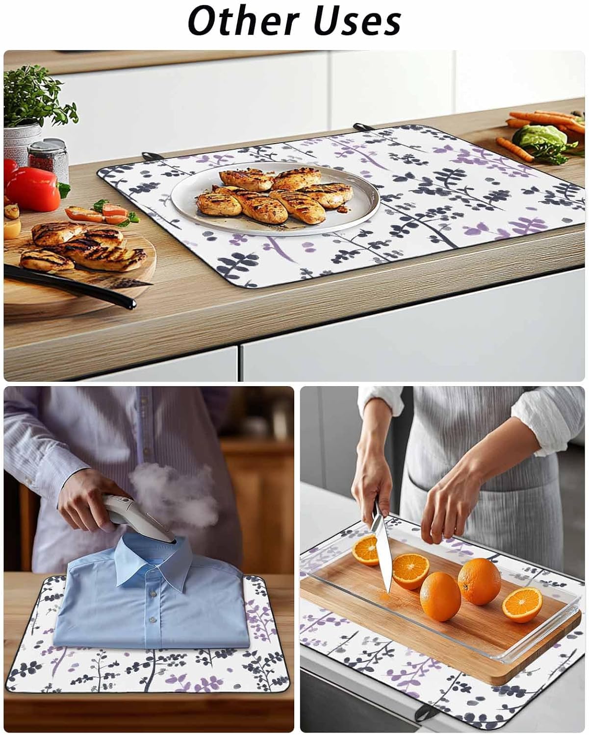 Stove Top Covers combine practicality and beauty, adding more color to your kitchen decorations.Product DescriptionMaterial: 100% Polyester cloth fabric surface with natural rubber backingSize Chart: 28.5x20.5 Inch / 24x21 Inch / 31x24 Inch / 36x21 InchExquisite WorkmanshipThe top is a layer of high-quality 100% Polyester and the bottom is rubber, which is waterproof, non slip, foldable and reusable. Will not move around when you prepare food on it.Counter Top ProtectorProtects electric, glass, or ceramic stovetop from scratches, scrapes, glass cracks, dirt & spills.Versatile UsesThe mat can be used as a stove top cover, counter top mat, ironing mat, washer top cover, coffee mat, flat top oven cover, dryer top cover, oven cover, refrigerator top cover, extra large rubber mat.Extra Counter SpaceThis stovetop cover is a one-stop solution for your many uses. It provides more worktop space for anything from food preparation to ironing. Therefore, this cooktop cover mat is perfect for kitchens with limited space.Ideal GiftThe exquisite pattern design makes the stove cover a perfect gift given to family friends and lovers. It adds color to your kitchen docor.Foldable and Easy StorageOur stove cover can be folded or rolled up and put away in your cabinet or cupboard when not in use.Special NoteNote: The mat may have creases from folding during shipping. This will smooth out in a couple of days.The colors may have slight differences due to different screens.