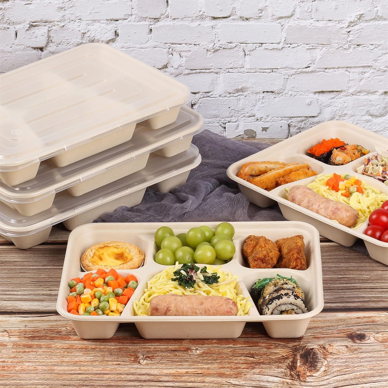 40 oz Sugarcane Fiber 6 compartments Paper plates. ★Included in the Box:40OZ Sugarcane Fiber plates, pack of 25 plates and 25 lids. ★Food-grade plates:Embossed design, perfect texture, can improve your quality of life.Plates smooth without burrs, brown primary color, our products are free of harmful bleaches, you can use it with confidence. ★Multiple usage scenarios:Thickened plates, water and oil proof. Perfect for daily use、family party、outdoor picnic、travel. Also can parking foods, it is a good take away food container. ★Perfect size:Suitable for daily diet, like salad、steak、spaghetti.Sturdy and durable, used well on many ways, like party、barbecue、camping、night snack. ★Meal prep:Our plates are safe for cold foods. They are safe to be putted in the freezer. Advance meal prep plates,diet portion control,healthy nutritious meals and to-go meals are super convenient