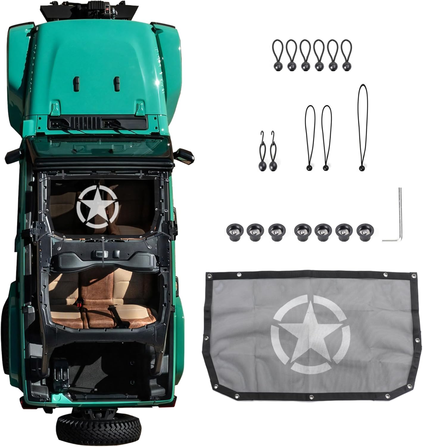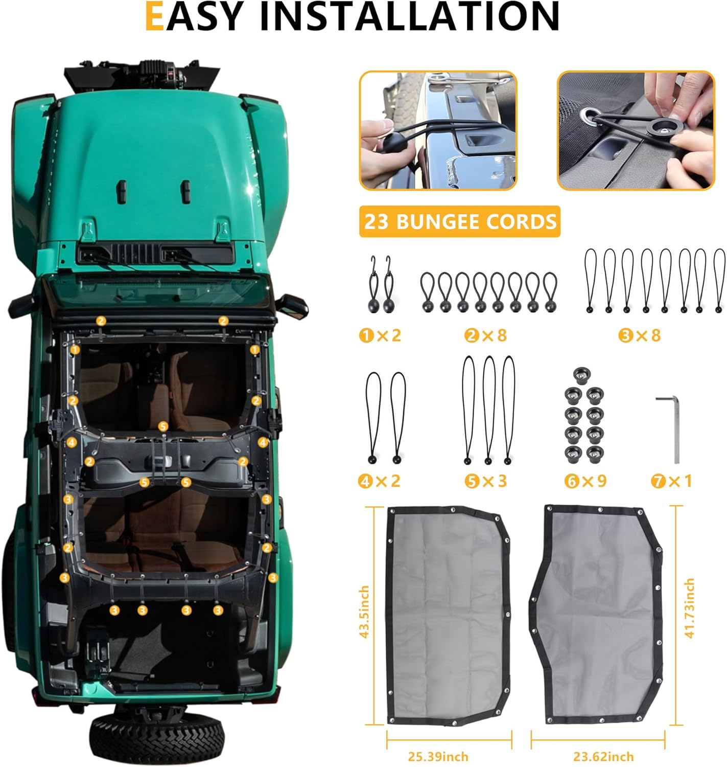 | Included Components | 1x Front sun shade for 2024 2025 2026 Jeep Wrangler JL 2/4 Door 4XE, 1x Rear sun shade for 2024 2025 2026 Jeep Wrangler JL 4 Door 4XE, 1x Screwdriver, 23x Bungee cords, 9x Nuts |