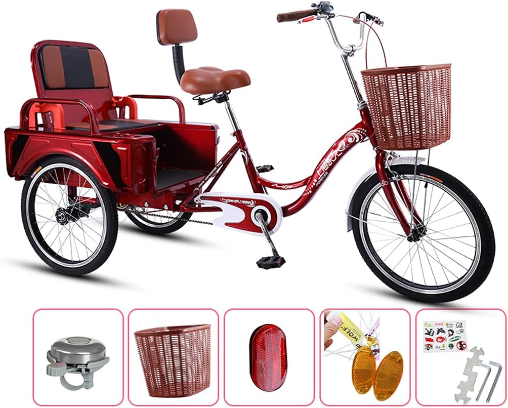 This tricycle will be a practical tool in your daily life. It can be used for entertainment, shopping or exercise. You no longer need to worry about riding while you have nowhere to carry your belongings. You can ride safely and comfortably on town streets, beaches or bike lanes; Features:The trike is made of high - quality Steel, and load - bearing rider and cargo combined weight up to 400 lbs. The aluminum alloy handlebars are adjusted on the basis of ergonomic design, which is more in line with the riding posture of the elderly and improves the comfort.The thicker frame tube wall combined with the ergonomic frame span is lower, making it easier for the elderly to get on and off the bike and ride more safely.The front brake of the holding brake has high sensitivity and strong braking, and the center of gravity does not slide to make riding safer.Anti - skid wear - resistant tires, longer service life, double - layer aluminum alloy knife ring anti - rust and no deformation, more stable riding.Specification:Model: Passenger and cargo dual - use modelsFrame: High carbon steel frameColor: red, blueBottom shaft: sealed bottom shaftRim: Aluminum alloy ringBrake: front V brake and rear brakeHandlebar: non - slip handlebarPedals: PVC pedalsPackage includes1 x 3 Wheels Bike